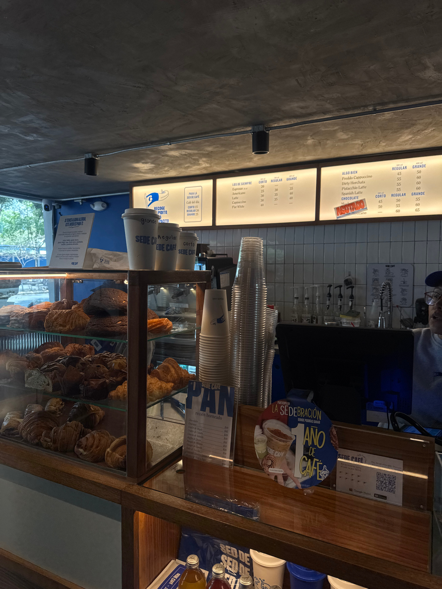 Here is a detailed description of the image: **Environment:** The image appears to be taken inside a bakery or cafe in Mexico City, Mexico, with a focus on the counter area. **People:** A person is…read more