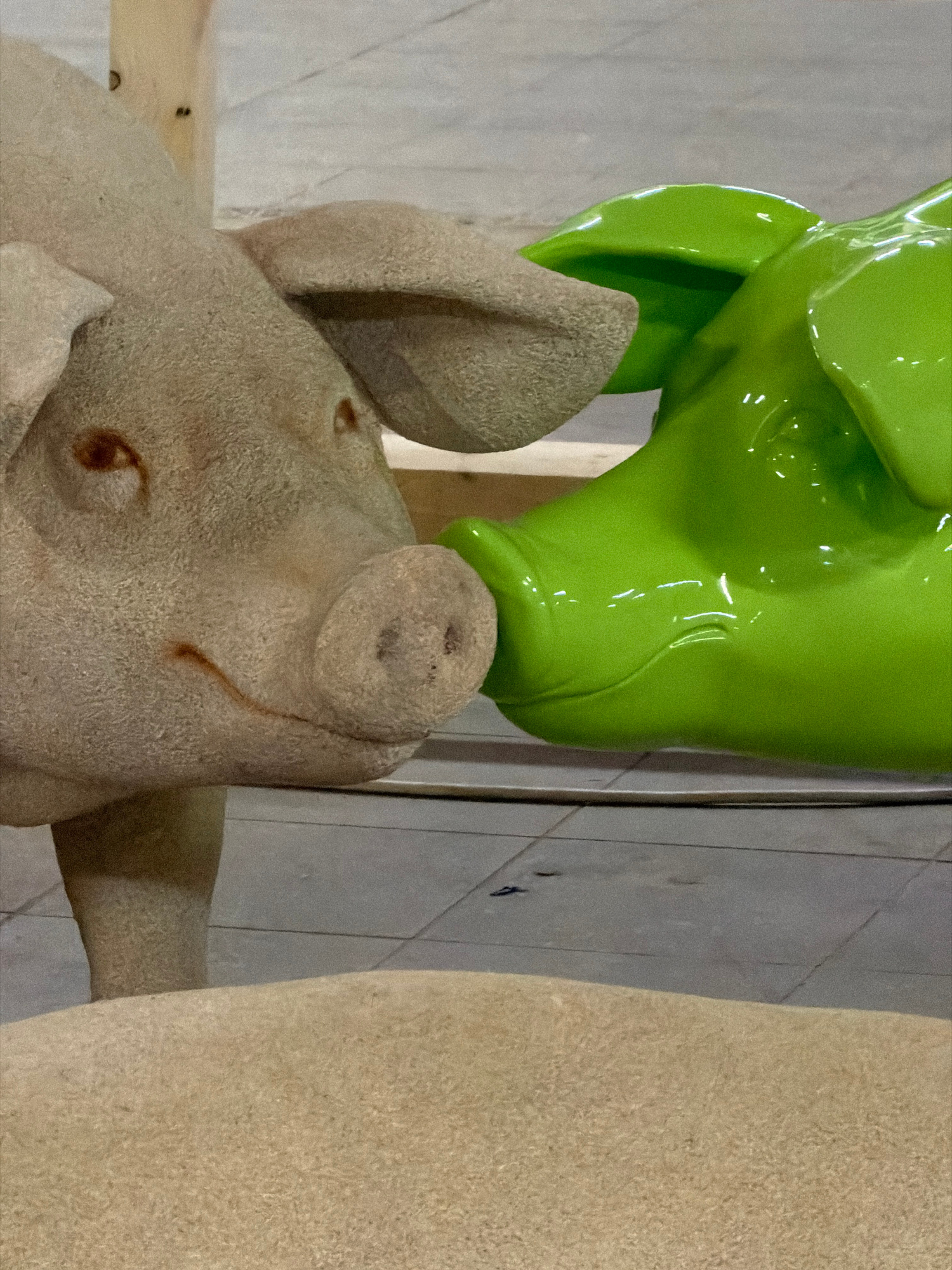 The image depicts a close-up view of two pig sculptures indoors. One sculpture, positioned at the top, is glossy and bright green. The other, located below, is tan, textured, and less reflective. They…read more