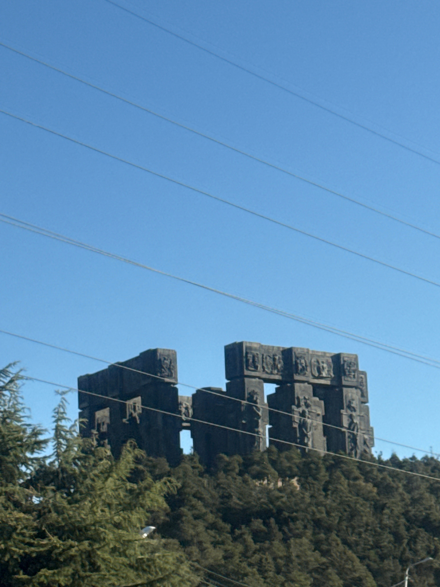 The image, taken from a low angle, features a section of the Chronicles of Georgia monument in Tbilisi. The monument, a large structure made of concrete, is partially obscured by trees. The monument f…read more