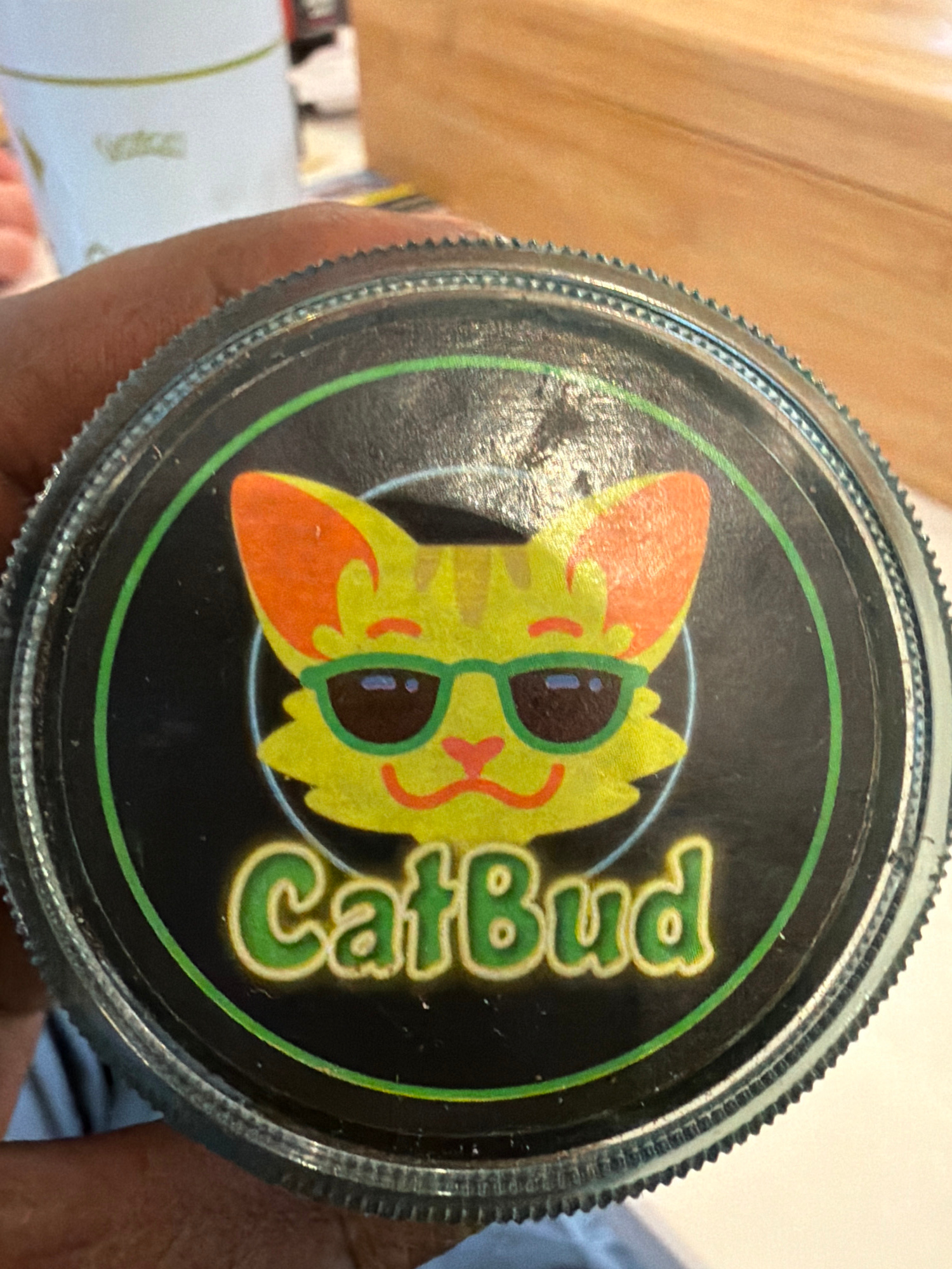 The image presents a close-up, slightly angled view of a circular container lid, held by a person's hand. The lid features a prominent black label with a vibrant central graphic. This graphic depicts…read more
