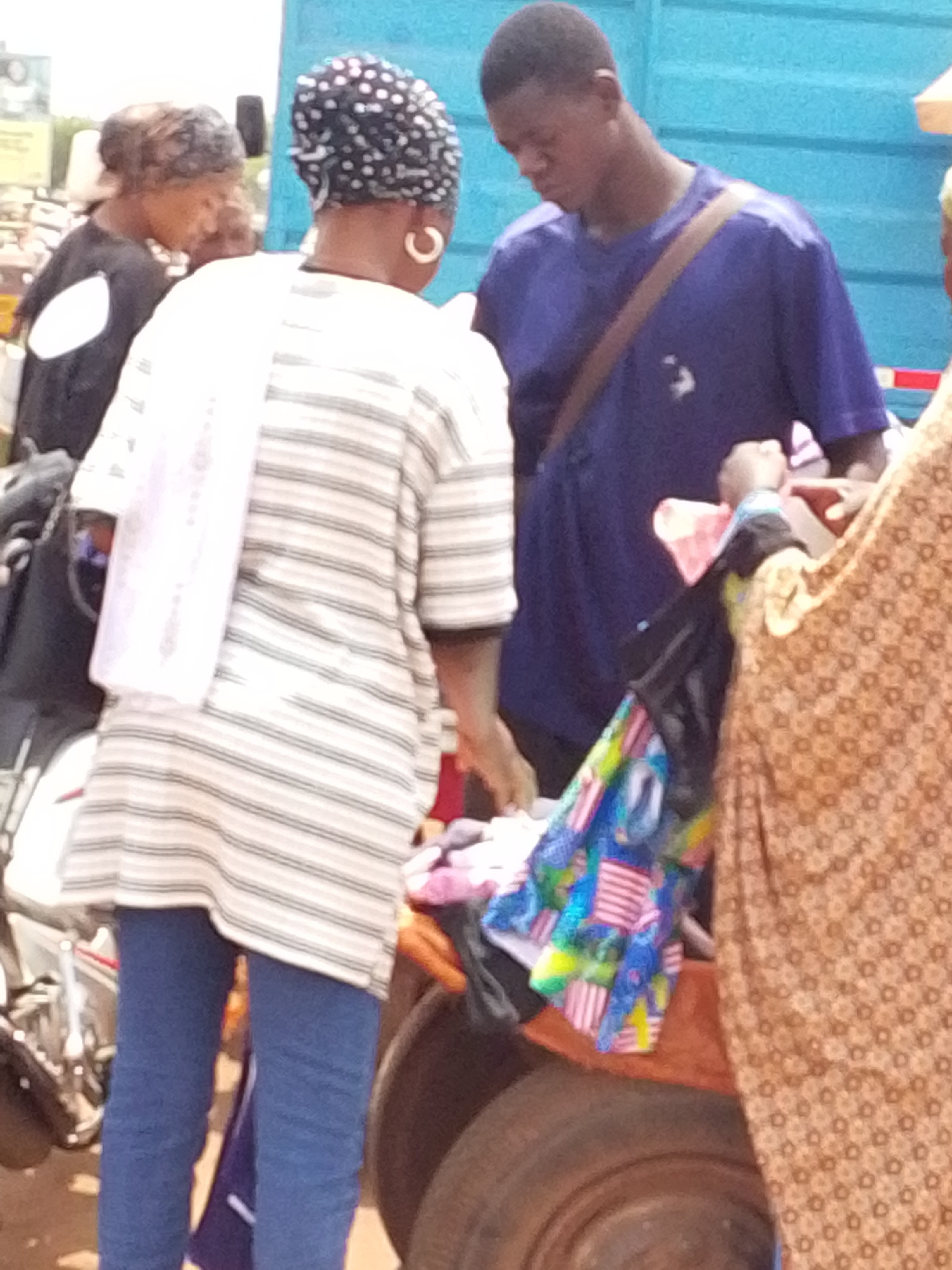 The image shows a street scene in Tamale, Ghana, with several individuals interacting around a makeshift vendor setup. A man in a blue shirt and brown strap bag looks down at items displayed on what a…read more