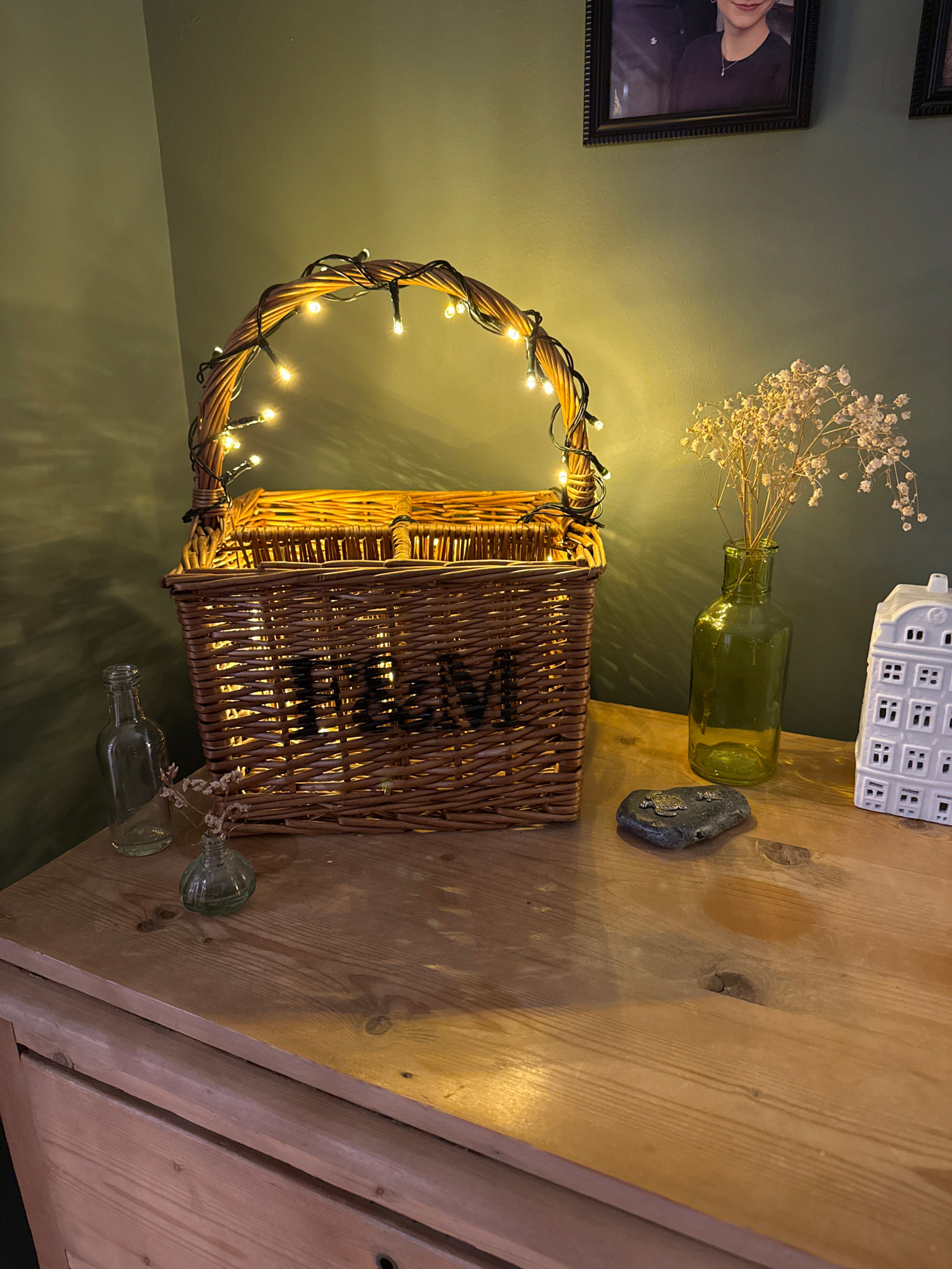 A wicker basket with fairy lights is placed on a wooden surface. Behind the basket are a small green glass bottle with dried flowers and a small white ceramic house-shaped ornament. The background is…read more