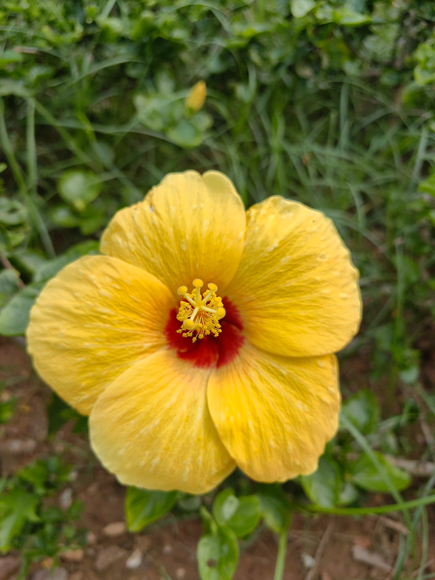 A close-up shot shows a vibrant yellow hibiscus flower with a deep red center, set against a backdrop of greenery and hints of brown soil. The flower is in full bloom, displaying its intricate stamen…read more