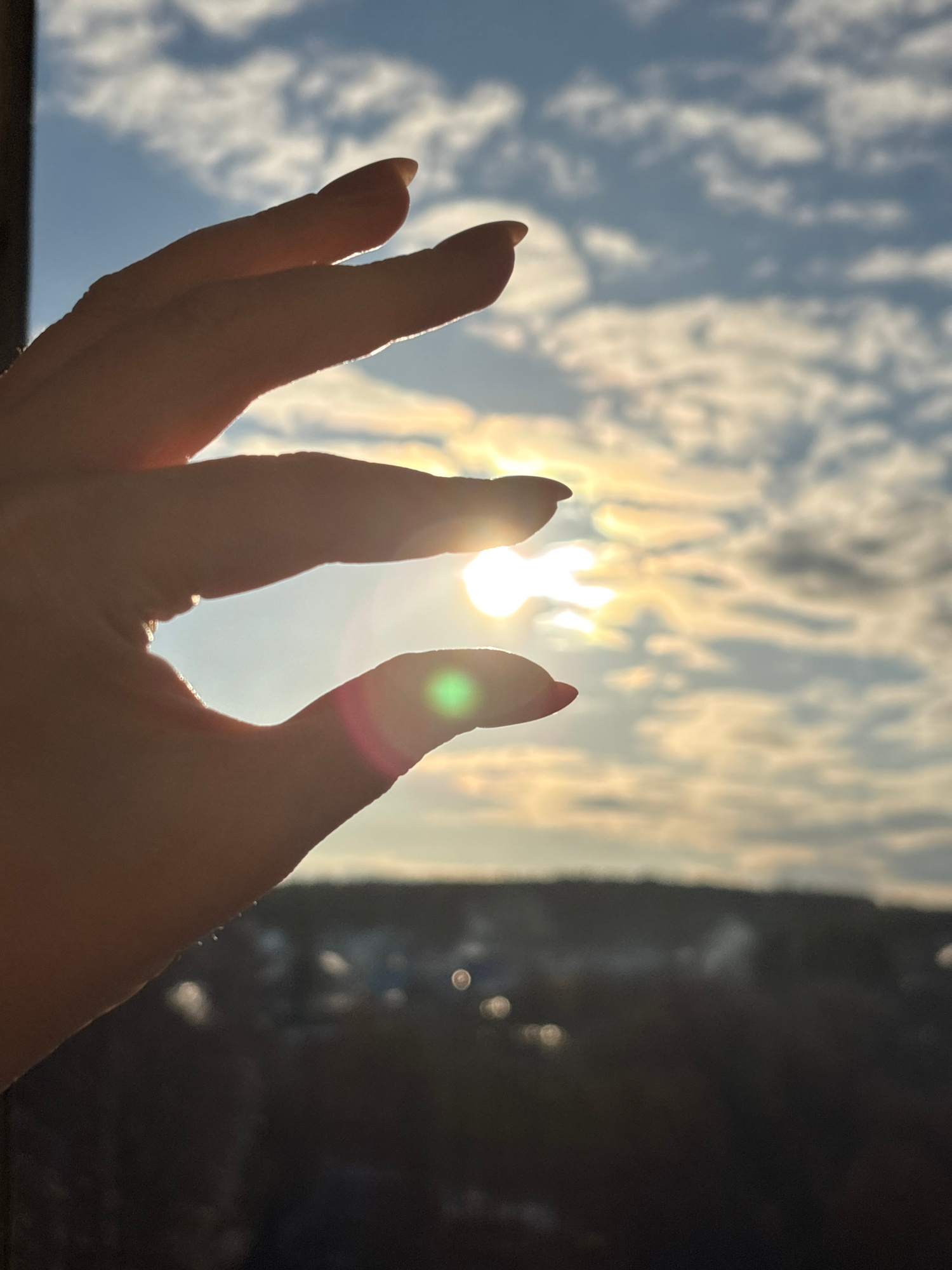 Here's a detailed description of the image: **Scene:** The image captures a hand reaching towards a bright, diffused sunlight breaking through clouds. The hand is silhouetted against the sky, with t…read more