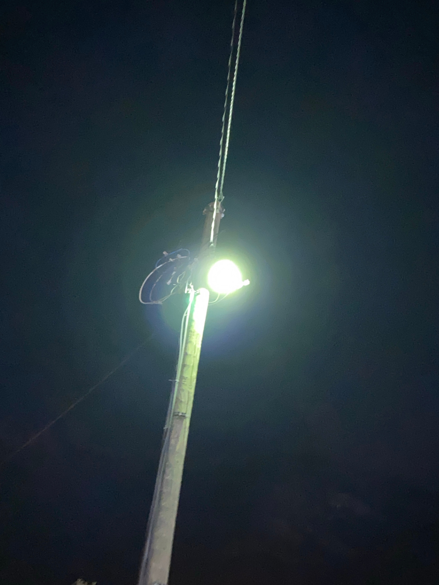 A pair of shoes is suspended from a utility pole near a street light. The scene is at night and it is dark. The location is unknown.