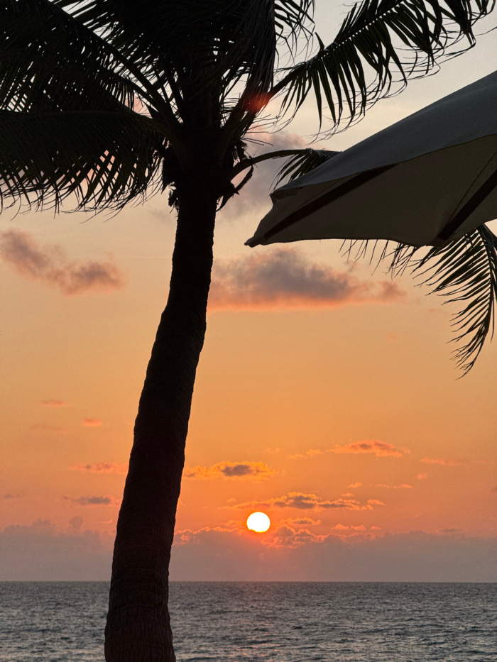 The image depicts a sunset over the ocean in Choeng Thale, Thailand. A dark silhouette of a palm tree trunk and its fronds occupies the left vertical portion of the frame. In the upper right quadrant,…read more
