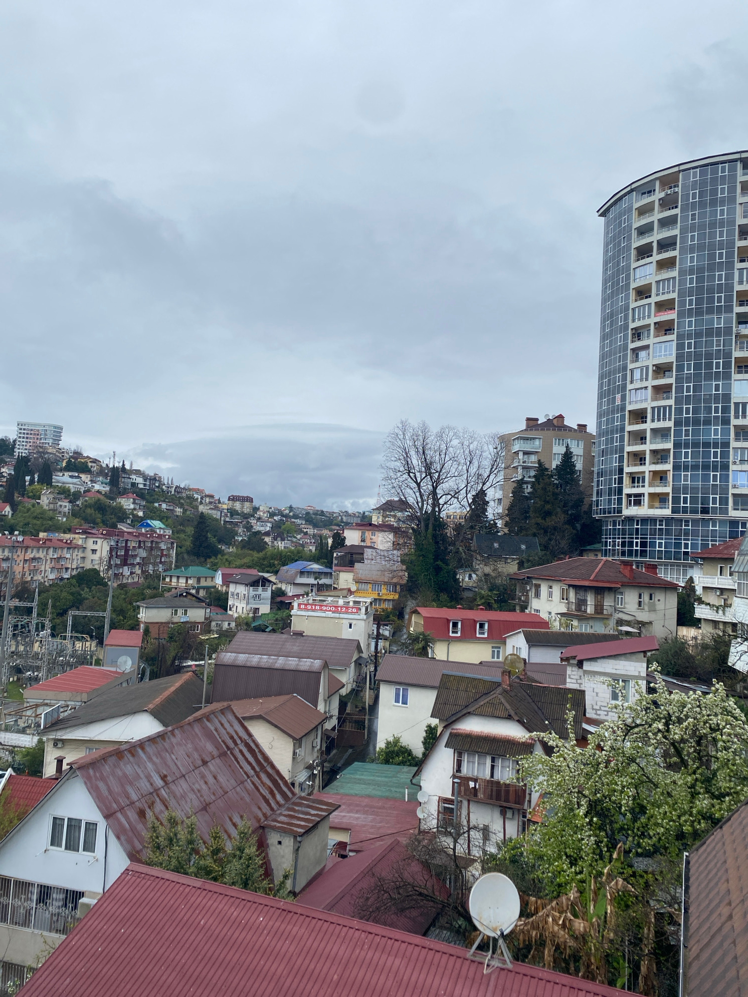 The image shows a cityscape of Sochi, Russia, taken from an elevated perspective. A tall, curved apartment building with a grid-like facade stands on the left side. In the middle ground, a dense colle…read more