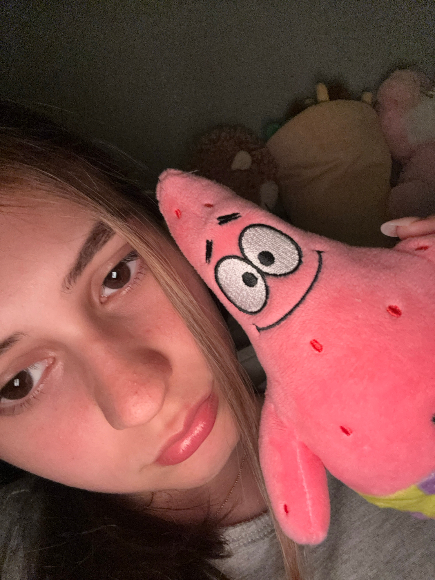 This close-up portrait shows a young person, likely female, lying down, with a pink plush toy of Patrick Star from SpongeBob SquarePants positioned on her head. The person has medium-toned skin, dark…read more