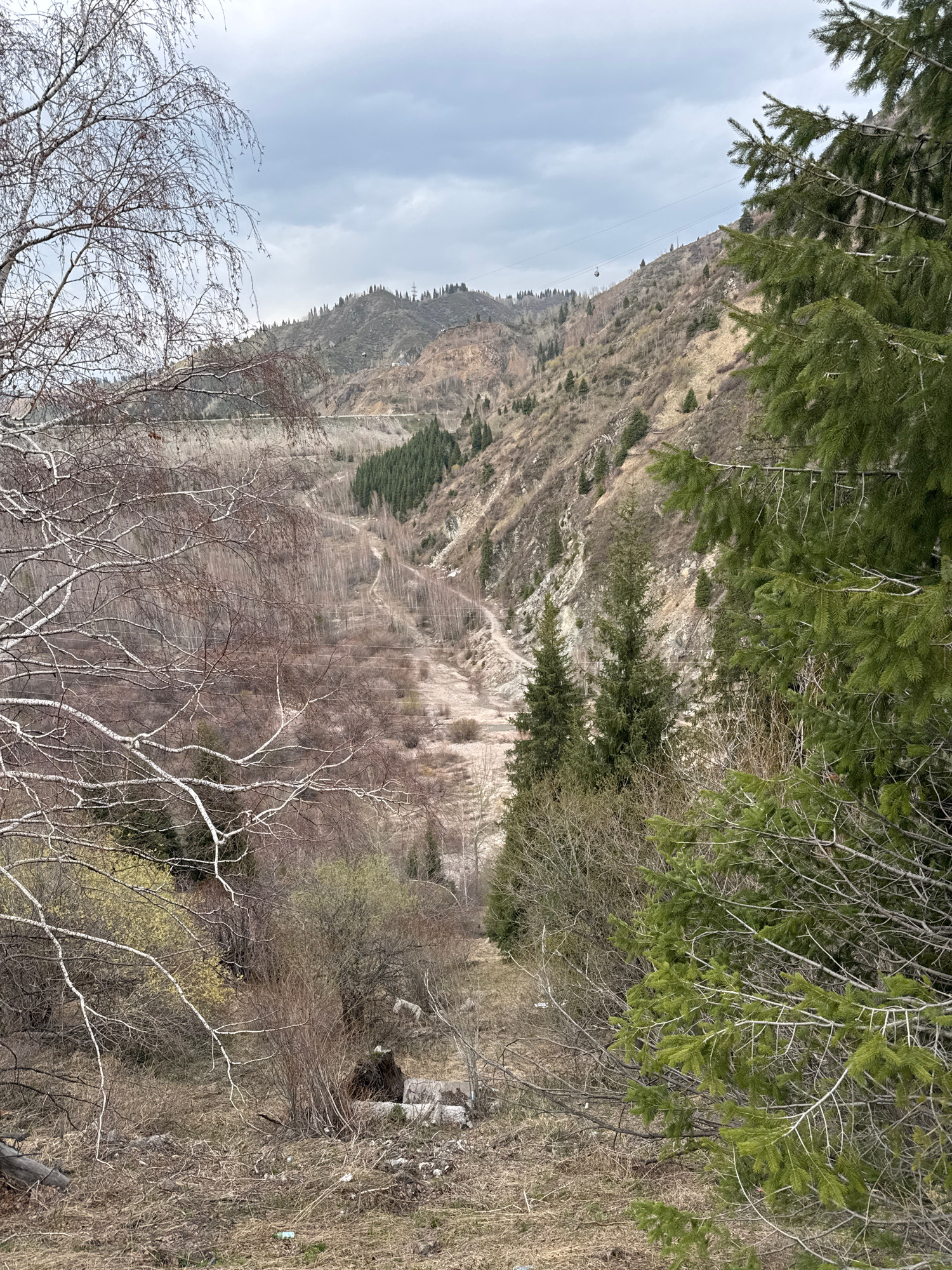 This image captures a vast mountainous landscape, likely a valley or gorge, under an overcast sky, taken from an elevated perspective. The scene is framed by various trees in the foreground. In the i…read more
