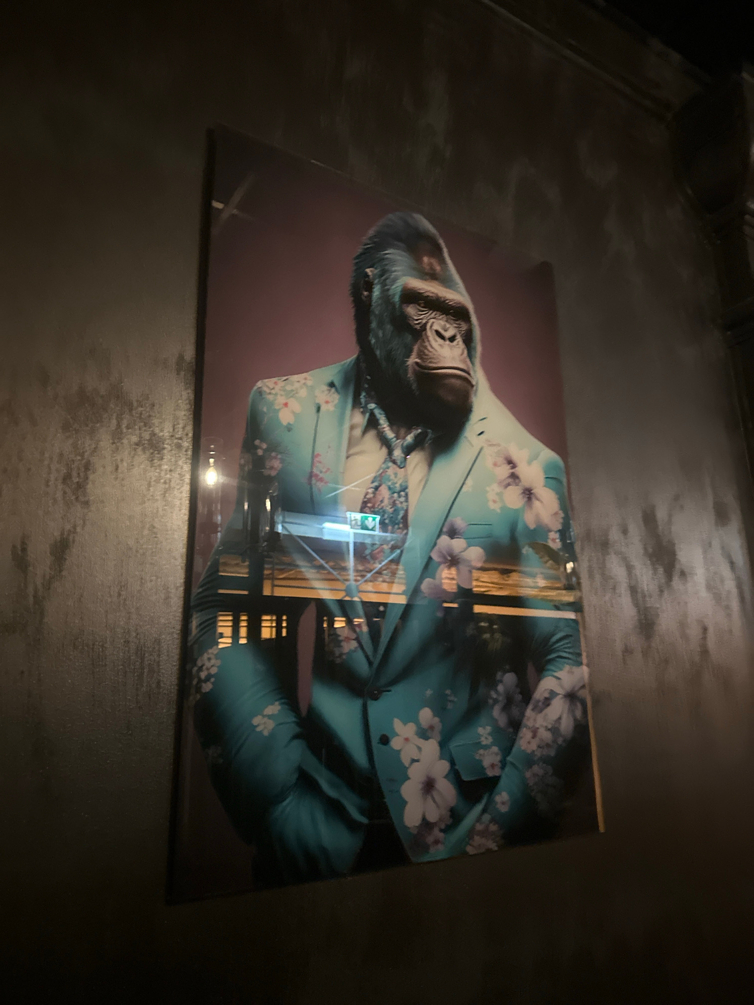 The image shows a photograph of a chimpanzee dressed in a blue floral suit. The photograph is placed on a dark, potentially wooden surface, possibly a table. The reflection on the photograph indicates…read more