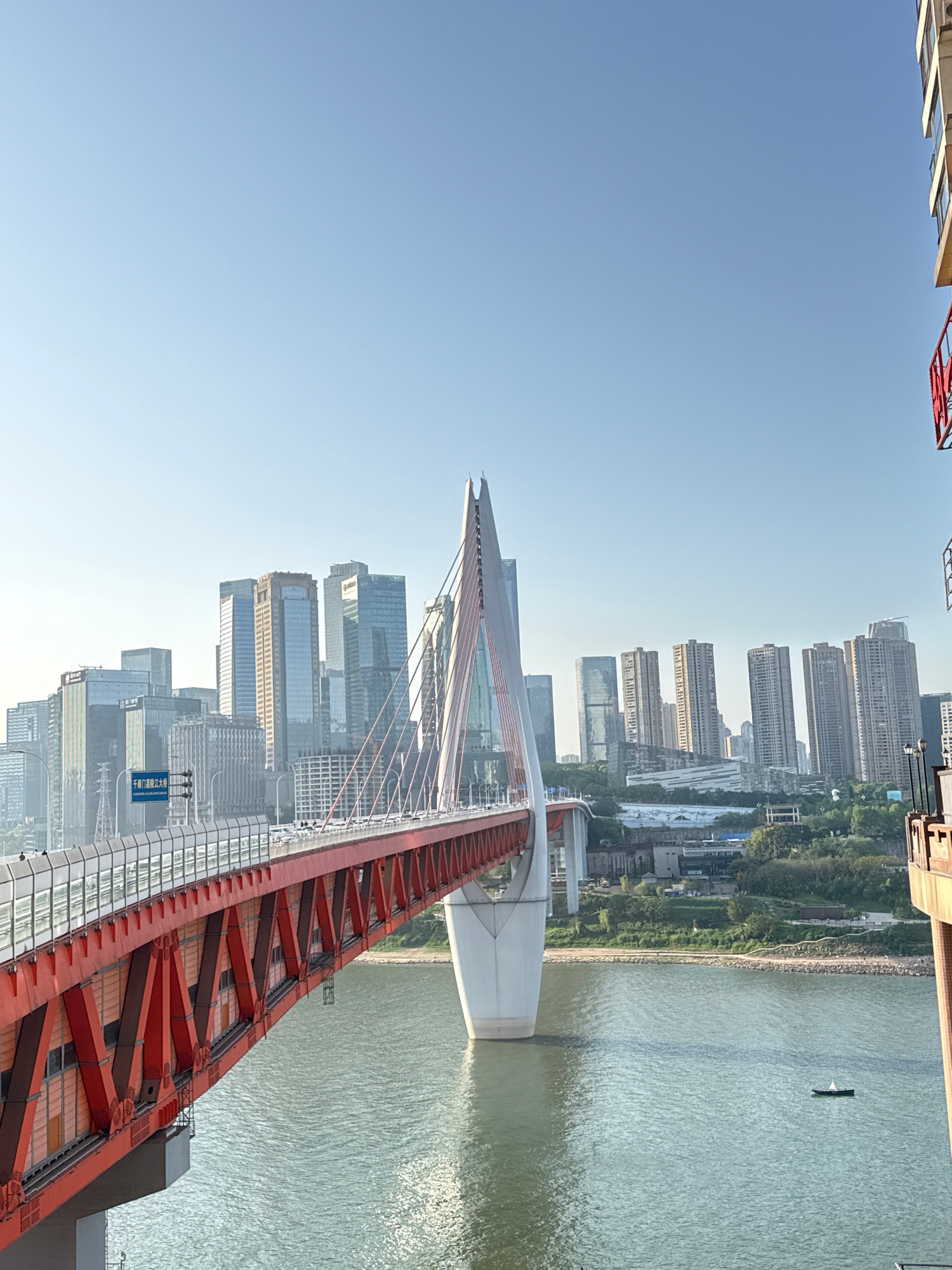 The image presents a wide, aerial view of a vibrant cityscape, featuring a prominent red bridge spanning a broad river under a clear blue sky. The scene is set during the daytime, with bright, even li…read more