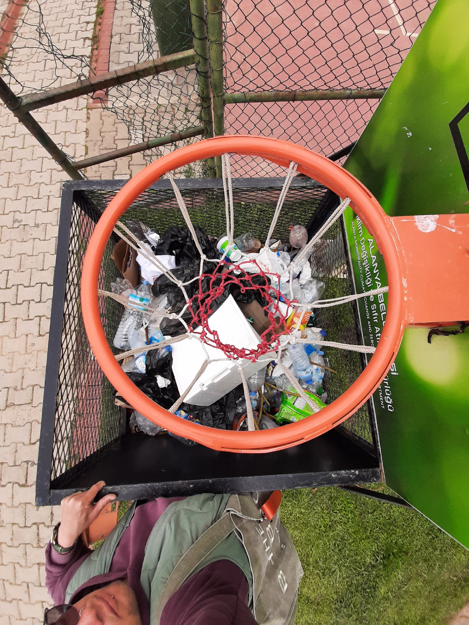 A top-down shot reveals an orange basketball hoop mounted over a black metal trash container. The container is filled with an assortment of trash, including plastic bottles and black plastic bags. The…read more