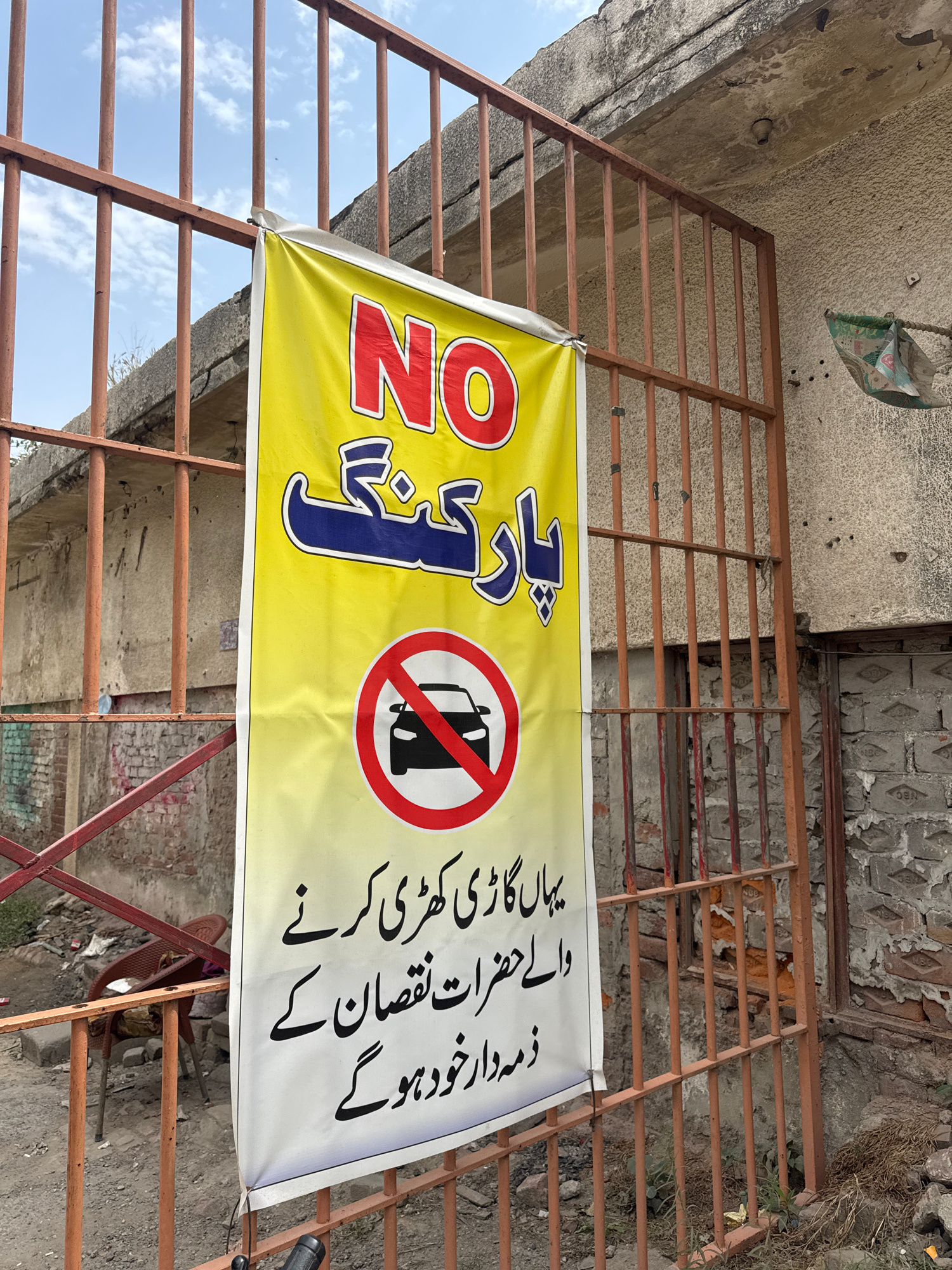 This image captures an outdoor scene in what appears to be an urban environment, specifically in Lahore, Pakistan. The central subject is a bright yellow banner, displayed vertically, that serves as a…read more