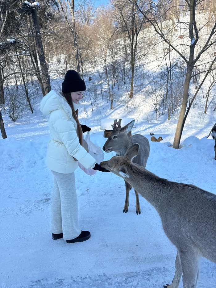 The image depicts a winter scene where a young woman is interacting with deer in a snowy, wooded environment during daytime. The woman, who has long brown hair, is dressed in warm winter attire includ…read more