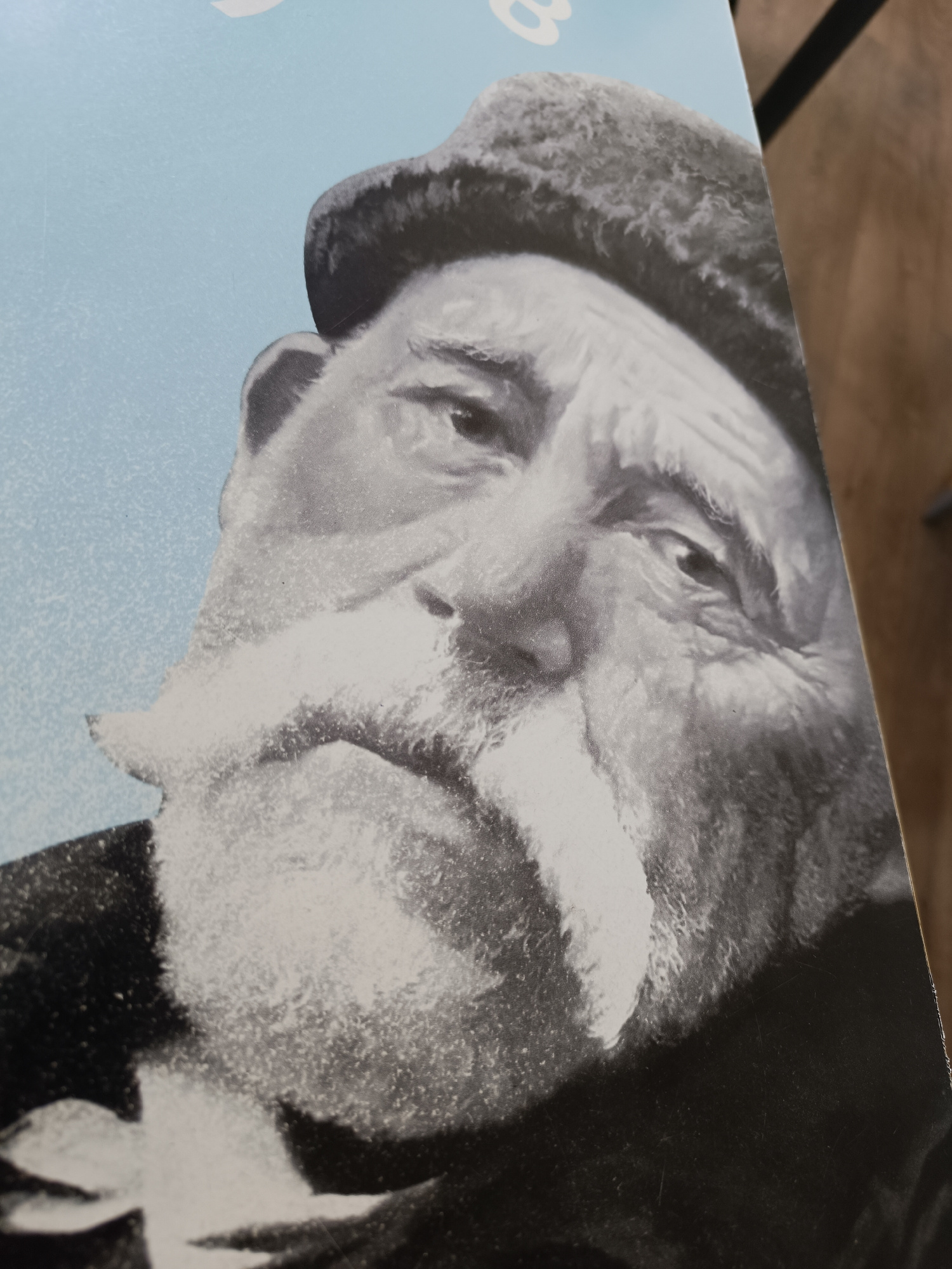 A black and white close-up image shows a portrait of an elderly man with a large, white, bushy mustache and a hat. The background is a light blue color. The image is on a surface that appears to be sl…read more