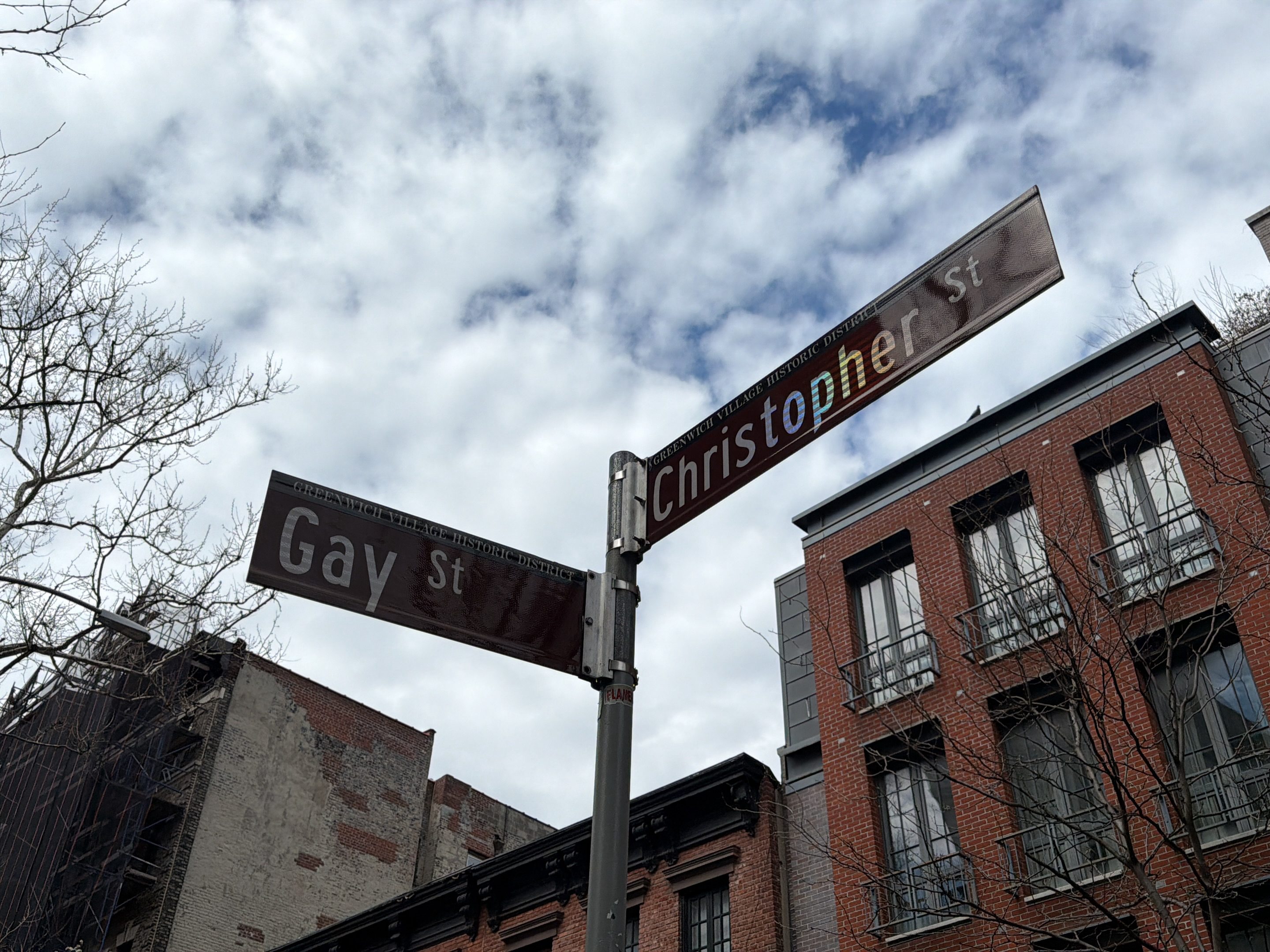 The image depicts a street intersection in New York City, United States, marked by street signs indicating "Gay St" and "Christopher St." The signs are mounted on a metal post. Buildings with brick faโฆread more