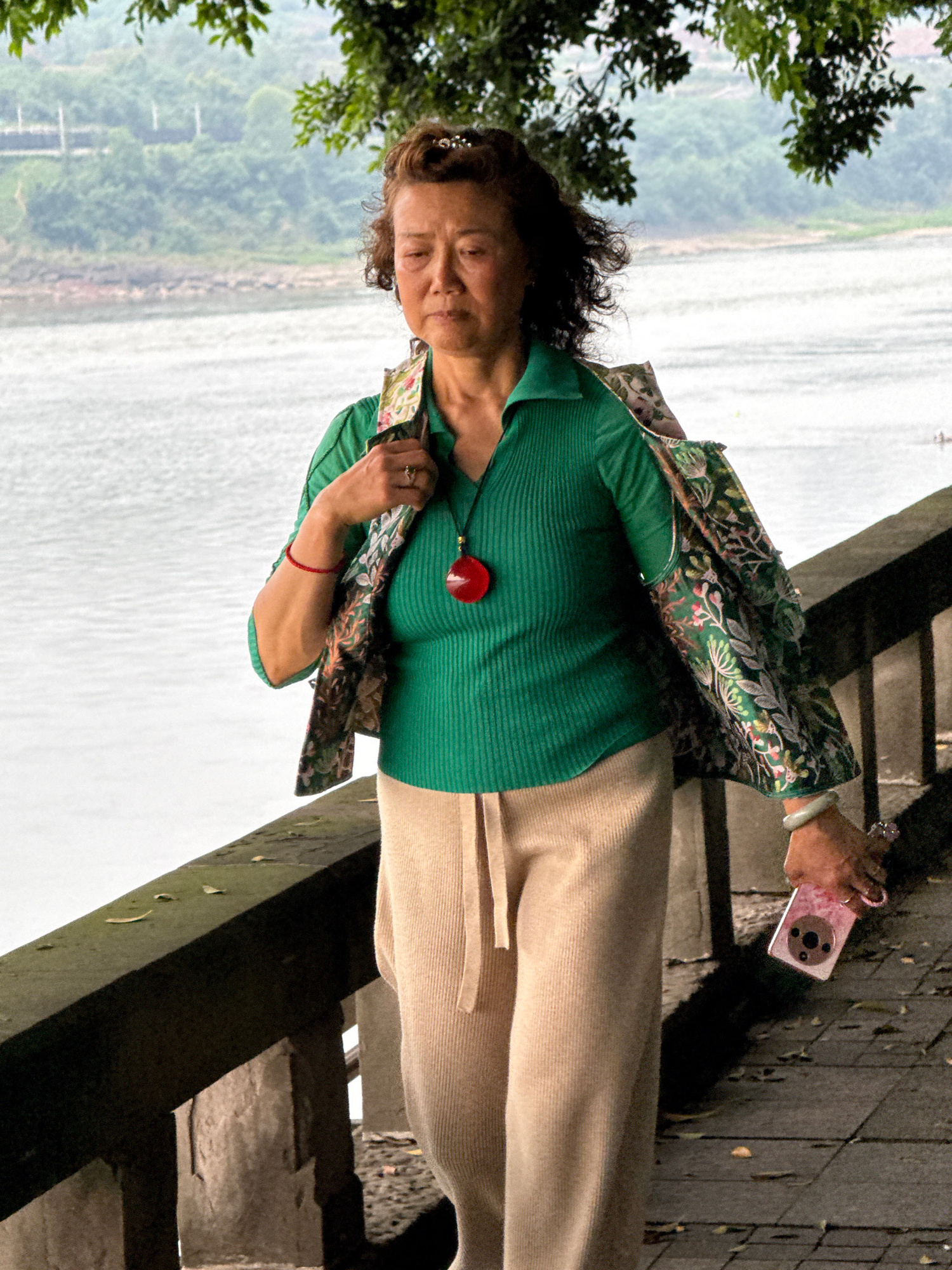 An older Asian woman stands outdoors, holding a pink smartphone in her right hand, while facing a broad expanse of water, likely a river. She wears a green, collared, ribbed shirt with a large red pen…read more