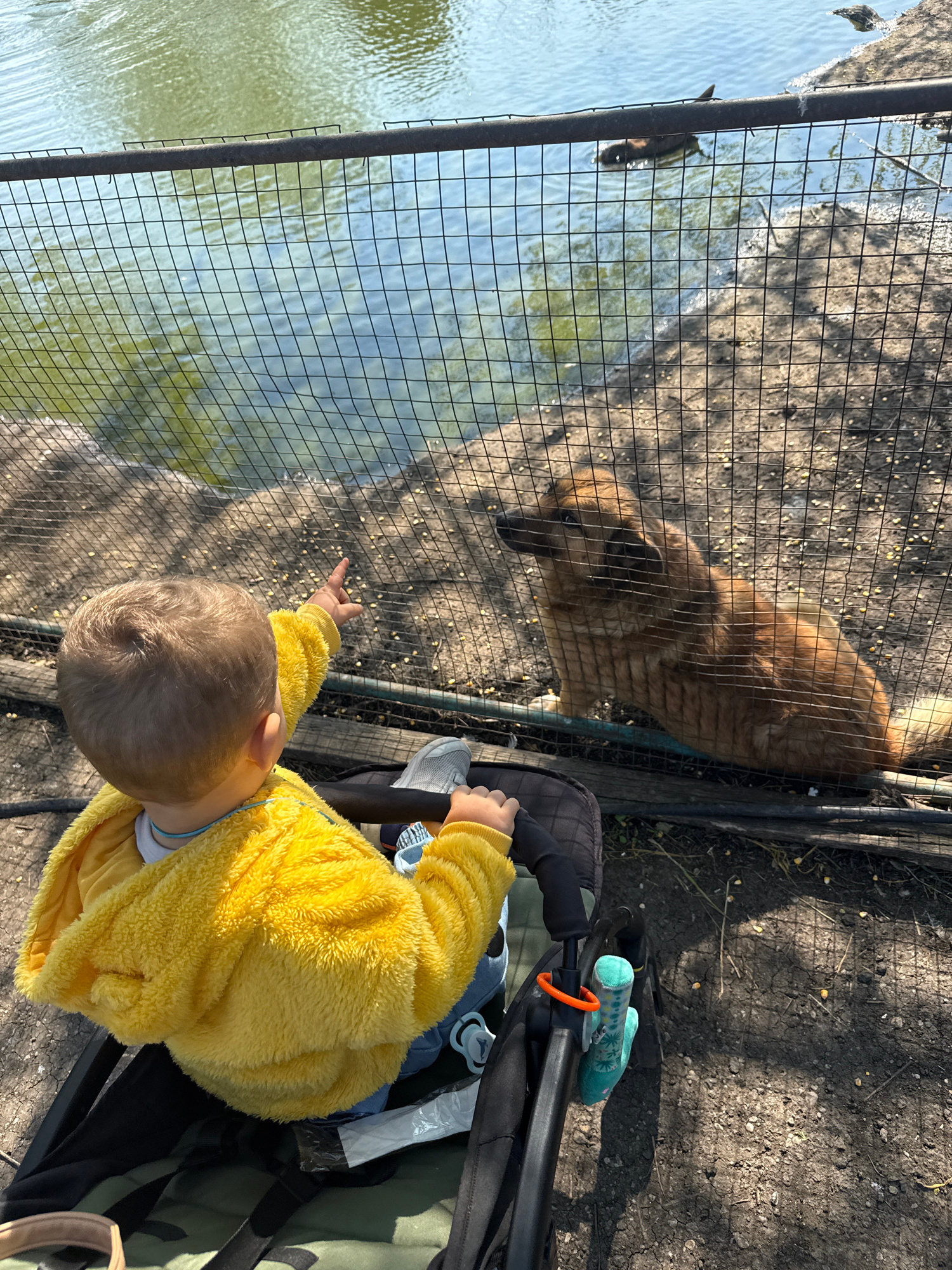 A child in a yellow jacket, possibly in a stroller, is pointing towards a pond or body of water enclosed by a chain-link fence. A brown dog is visible on the other side of the fence. A duck swims in t…read more