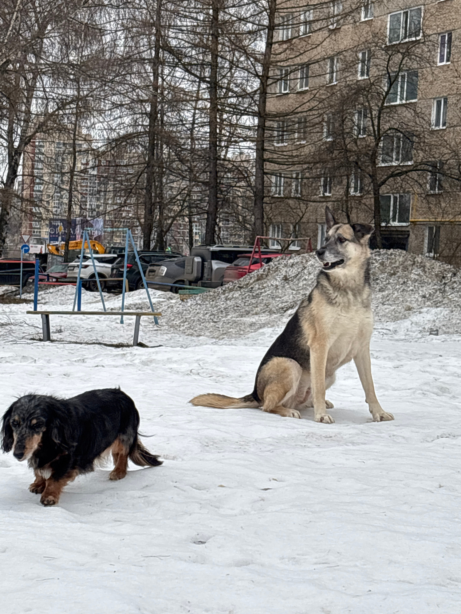 The image shows two dogs in a snowy outdoor setting, likely a residential area based on the presence of apartment buildings and parked cars in the background. The foreground features a large dog with…read more