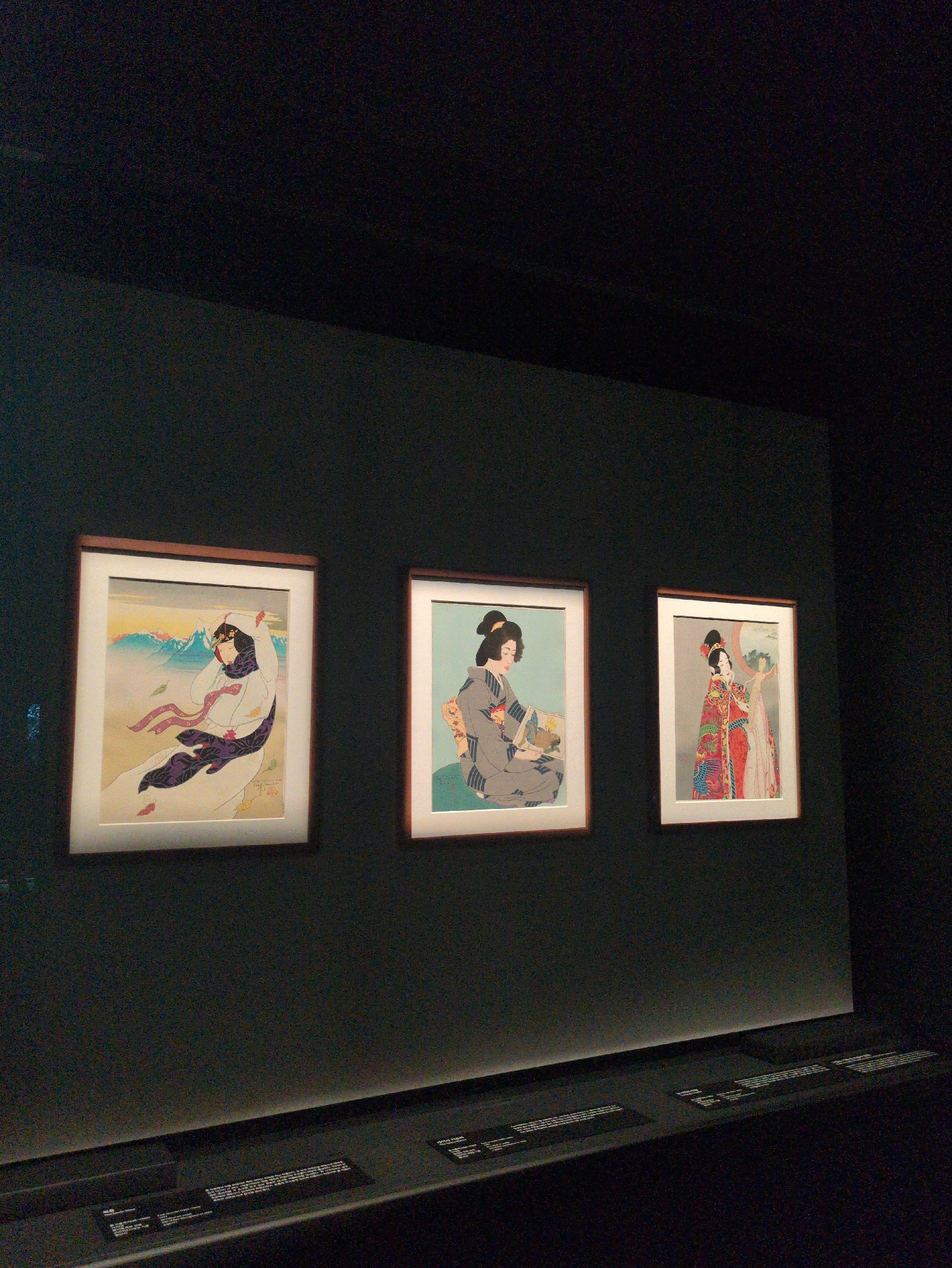 Three framed Japanese prints of women hang vertically on a dark-green wall in a dimly lit space. The prints are framed in light-brown wood frames with white borders. Each print depicts a woman in trad…read more