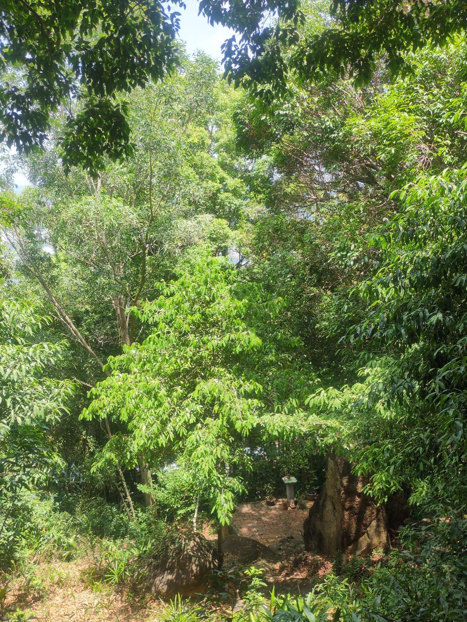 The image shows a dense, green forest environment, with a path leading up to a rocky outcrop. A metal structure, possibly a marker or sign, is visible on the path near the outcrop. The image is taken…read more