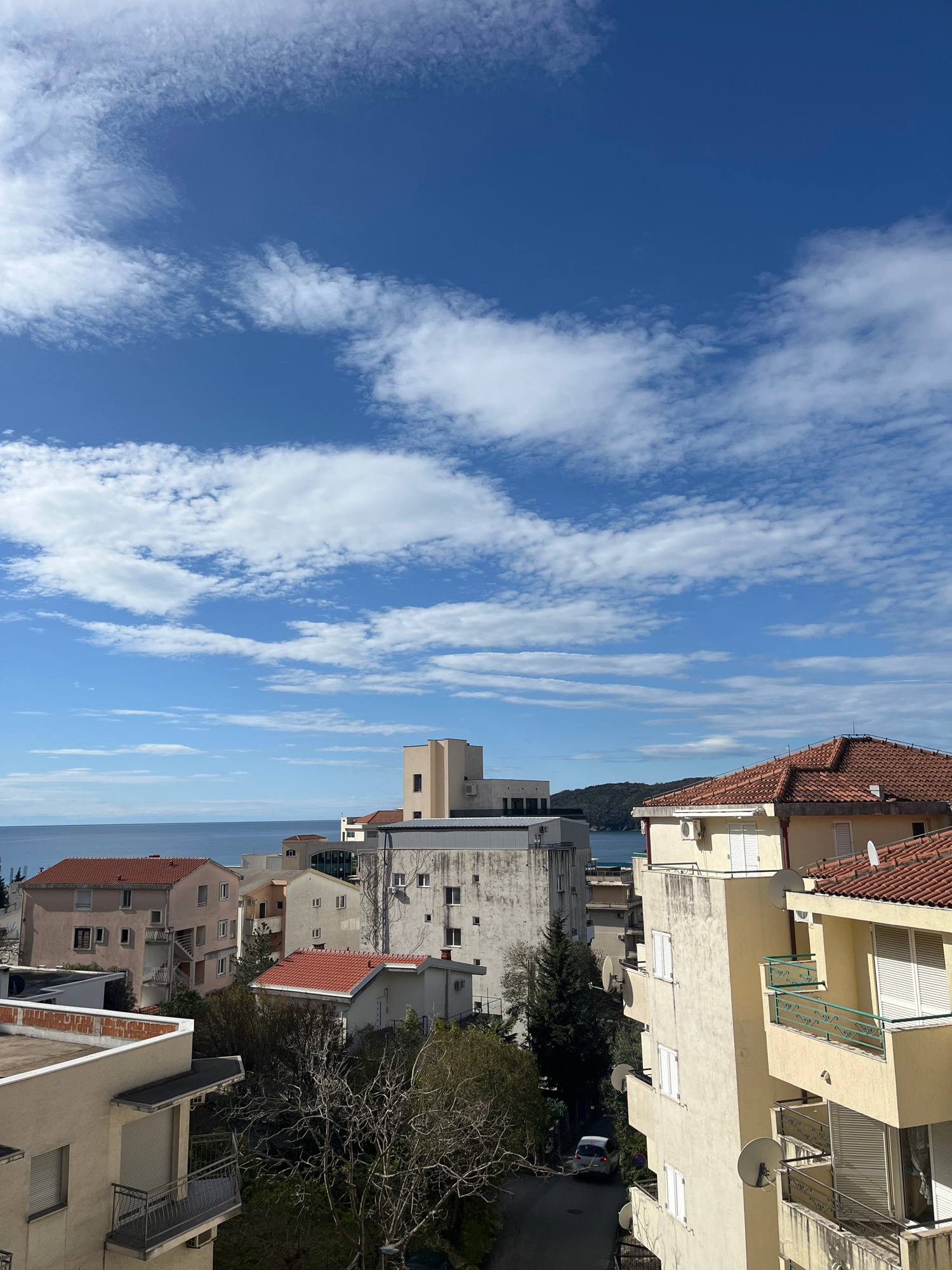 The image captures an outdoor daytime scene from a high vantage point in Boreti, Montenegro. Buildings with red-tiled roofs and light-colored exteriors occupy the right side of the frame. Balconies an…read more