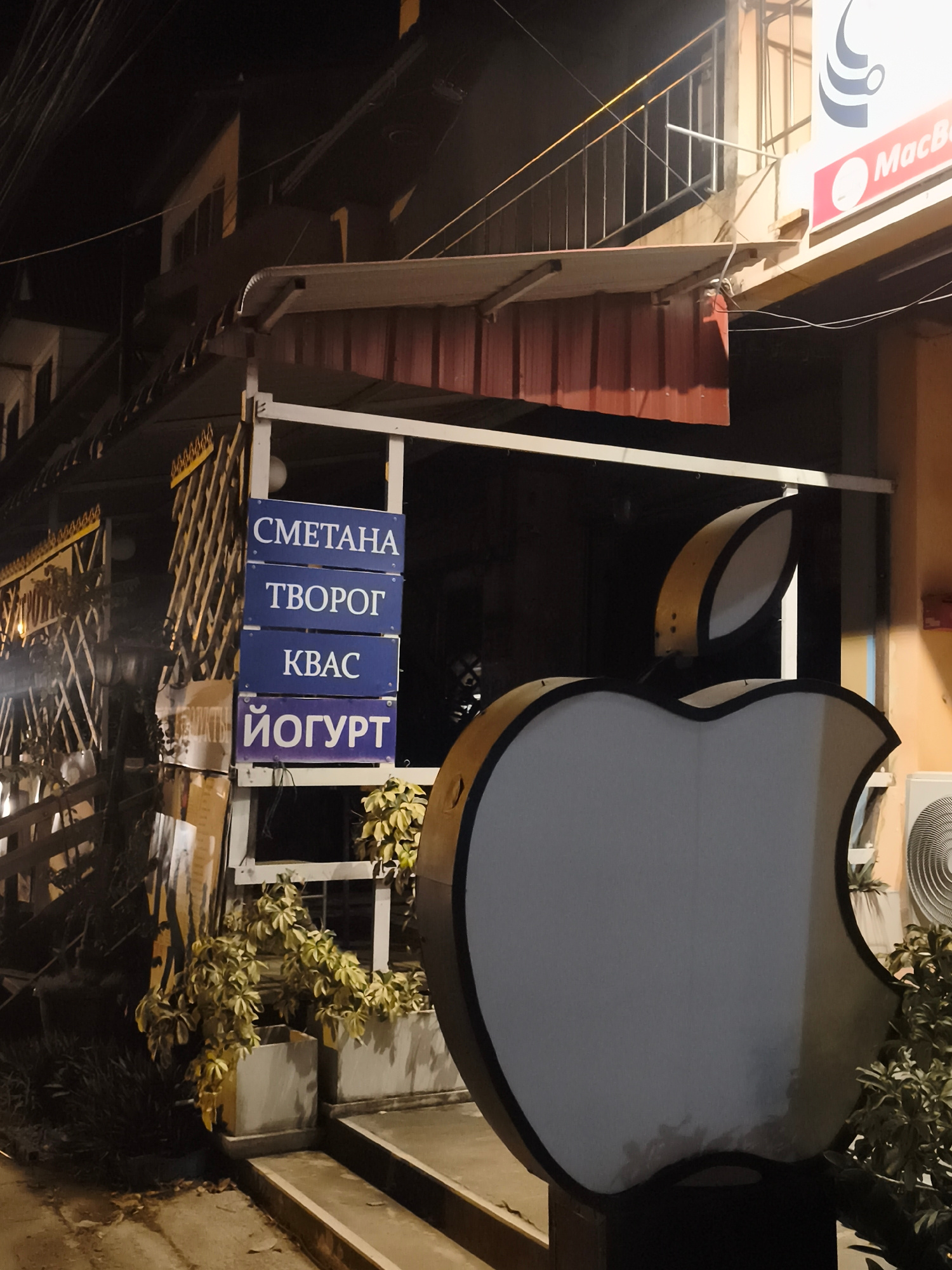 At night in Baan Bo Phut, Thailand, a restaurant exterior is visible. A large apple-shaped sign stands prominently in front of the restaurant, obscuring a full view of the entrance. To the left, a sig…read more