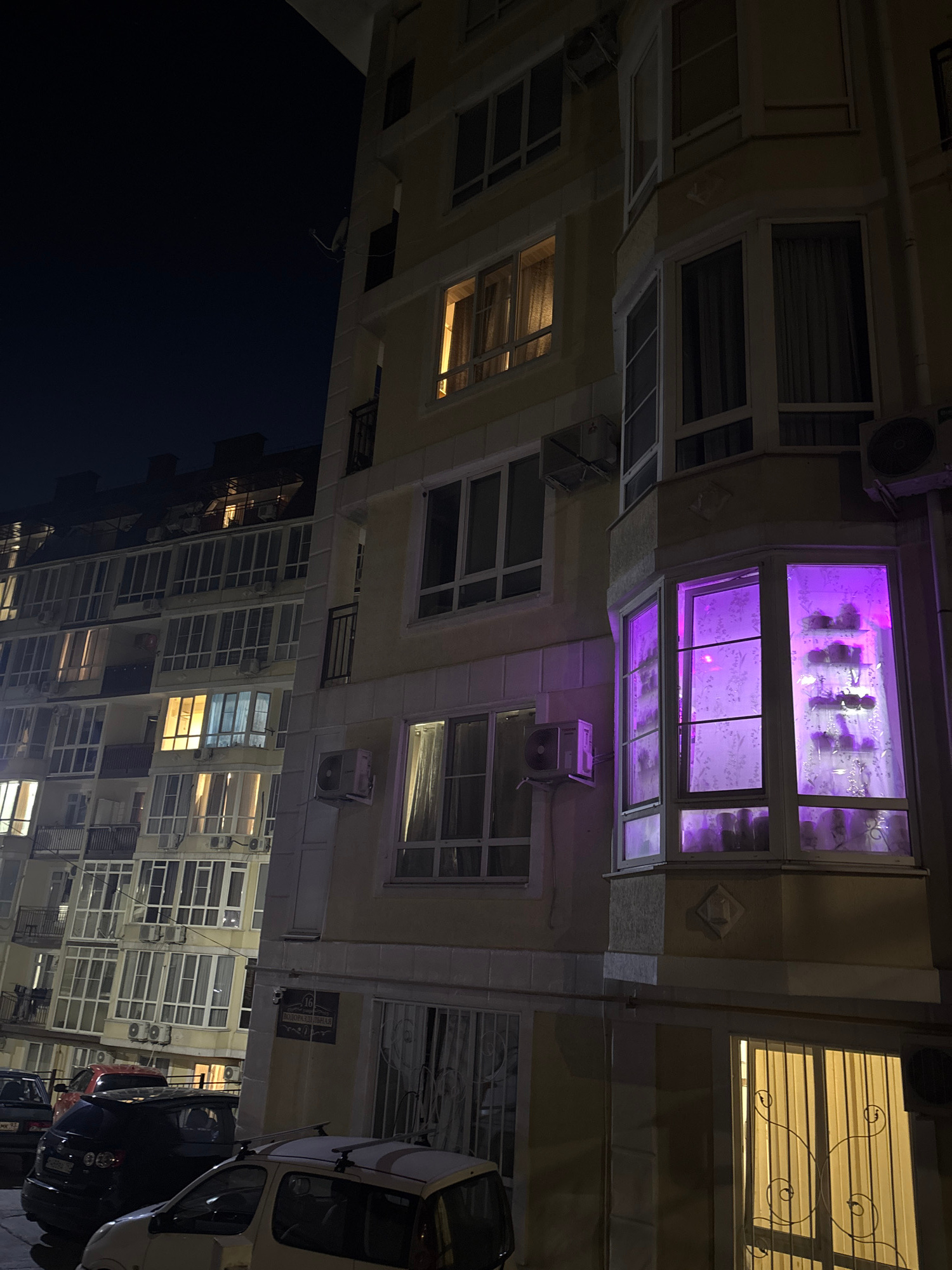 The image shows an upward view of an apartment building in Sochi, Russia, at night. The building is multi-storied, with numerous windows. Most windows are dark or lit with a warm, yellowish light. One…read more