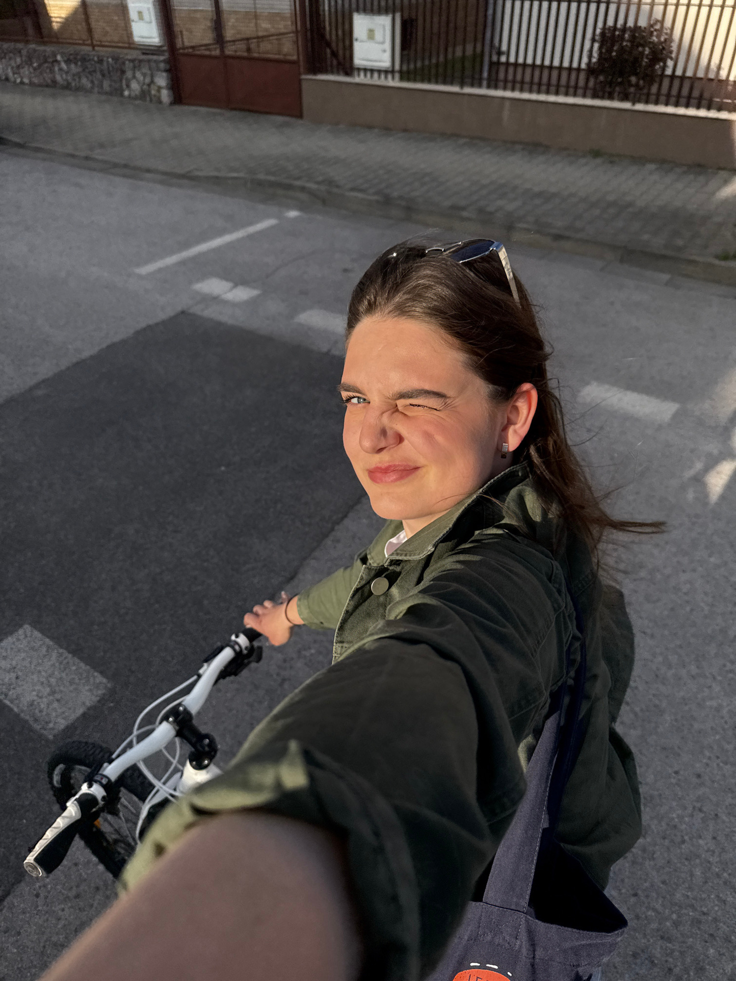 A young woman is riding a bicycle on a street in Trnava, Slovakia. She is wearing an olive green jacket and has sunglasses perched on her head. She is also wearing a dark-colored tote bag over her sho…read more