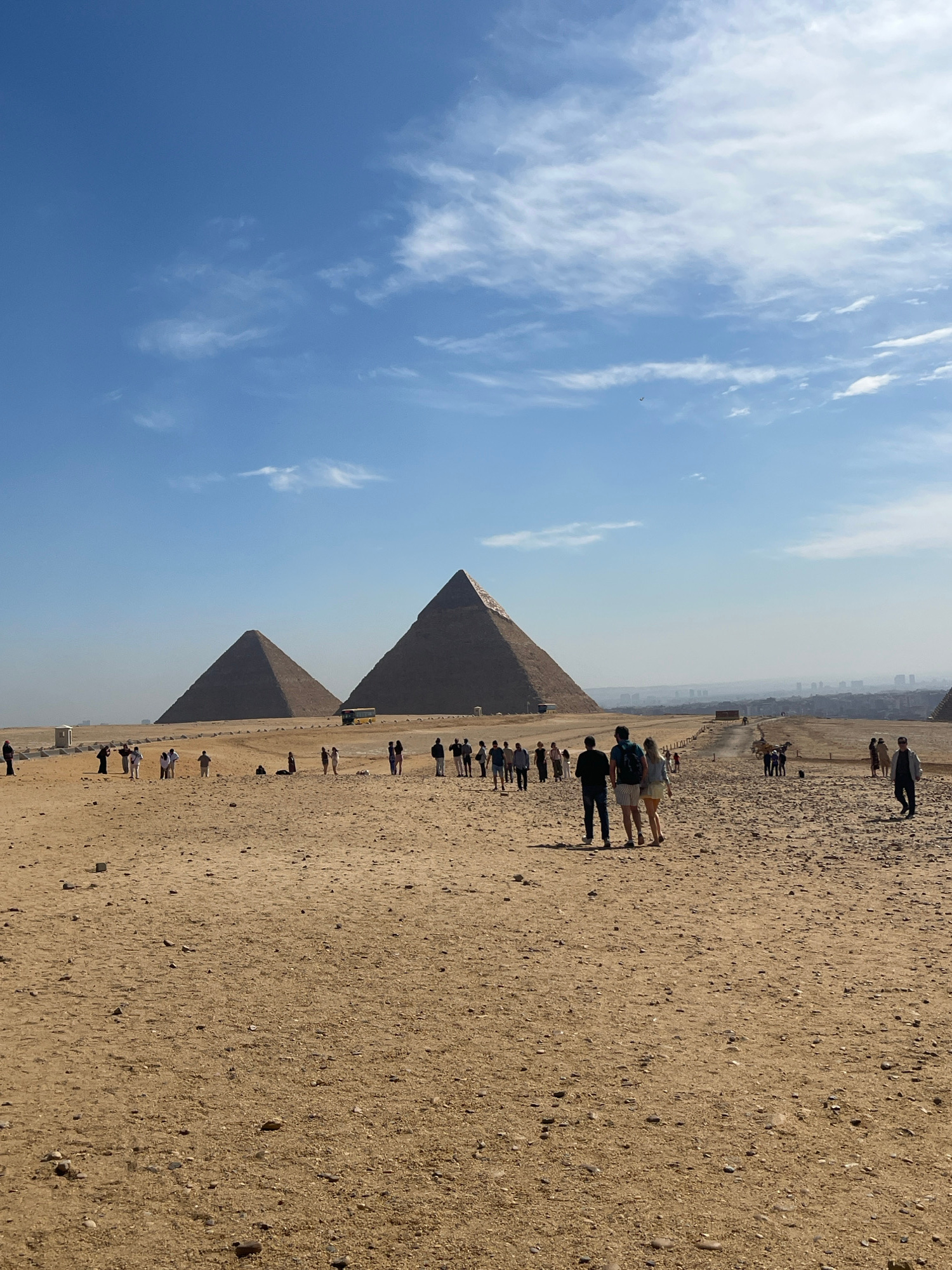 The image shows the Great Pyramids of Giza in Egypt, viewed from ground level. The sky is partly cloudy and blue. The pyramids are in the middle of a sandy desert environment. Groups of people are visβ¦read more