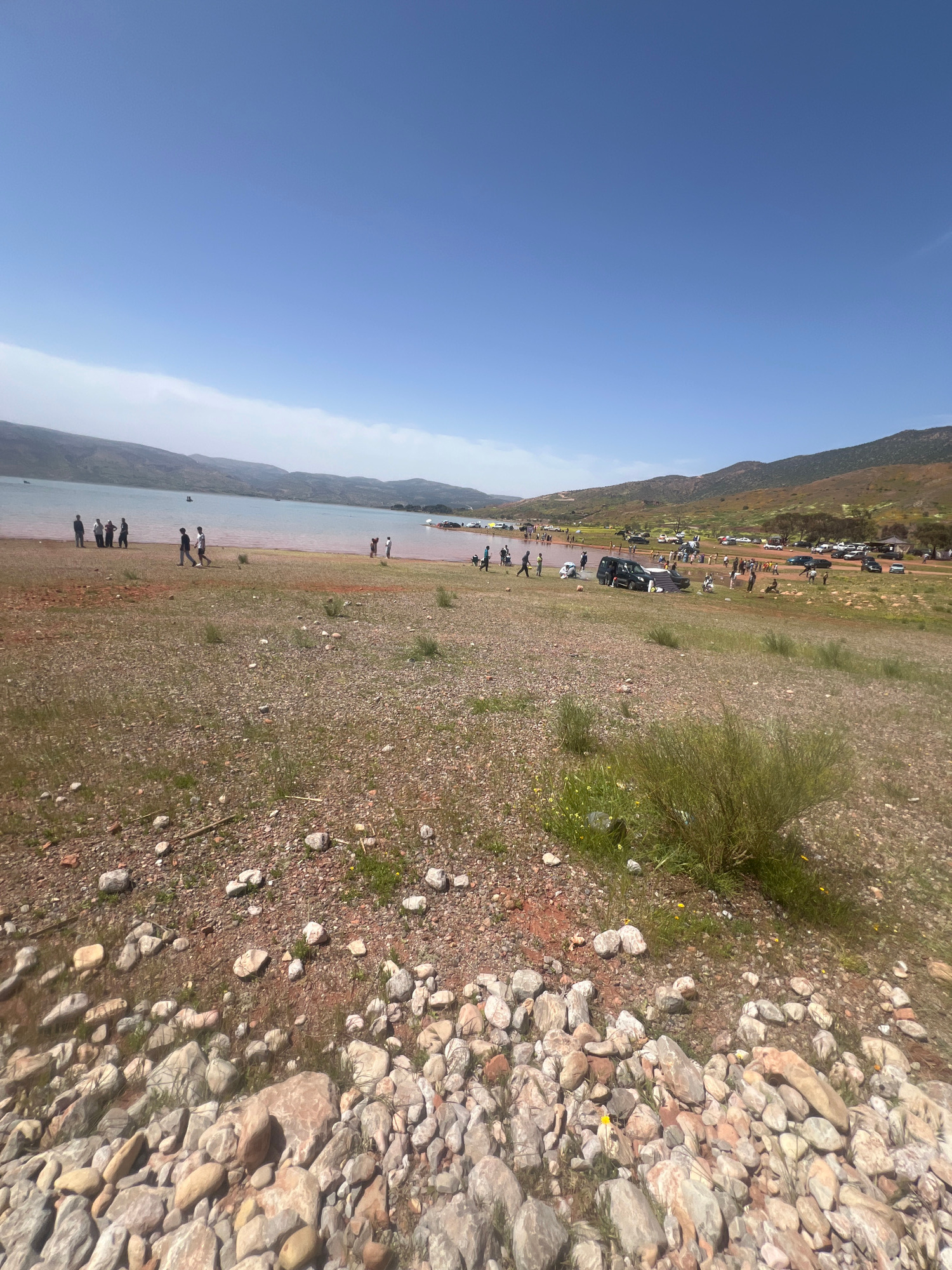 The image depicts a scene at Bin El Ouidane, Morocco, featuring a rocky shoreline with a lake or reservoir visible. People are gathered near the water's edge. Beyond the shoreline, a green, grassy are…read more