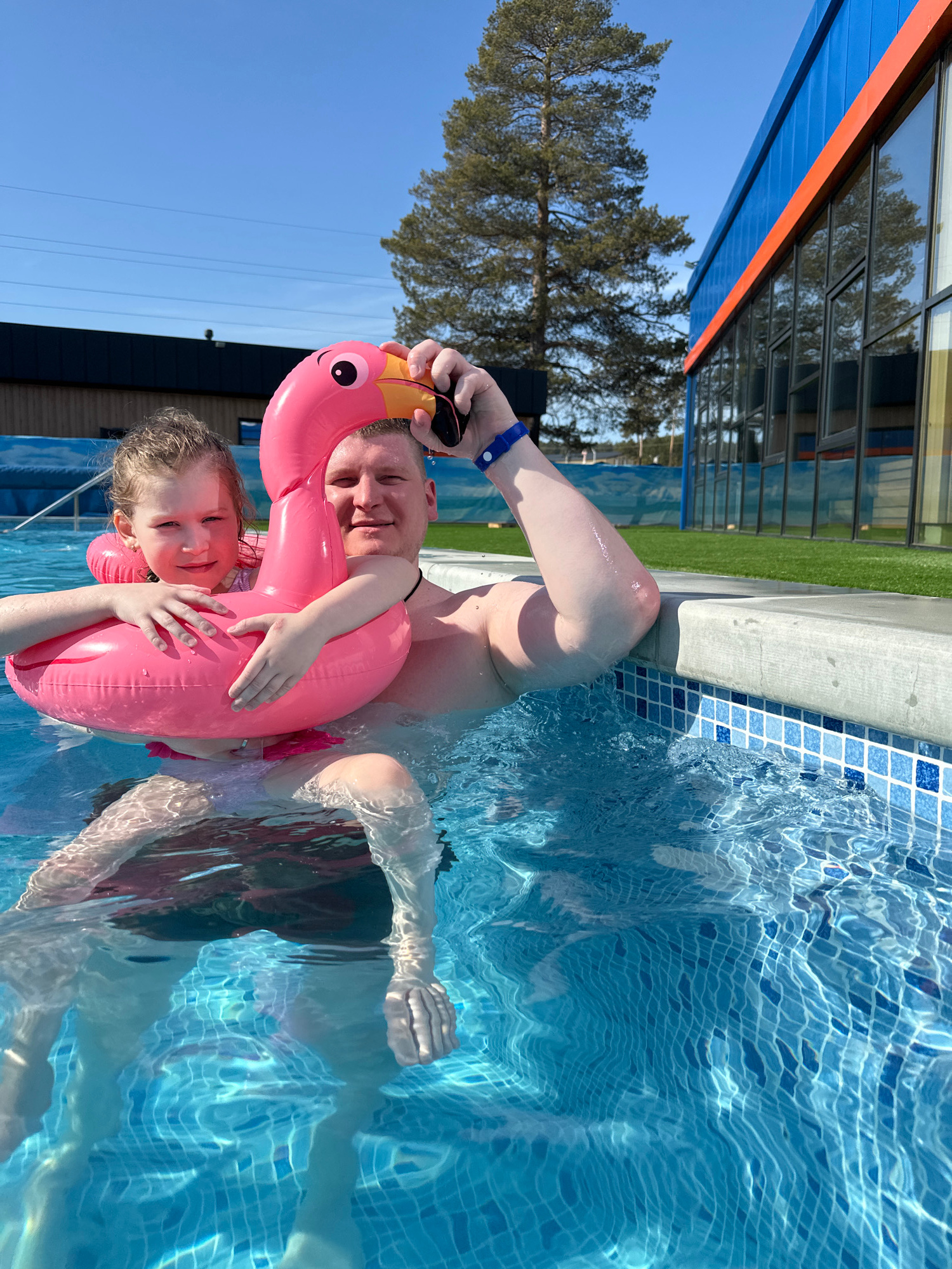 A family poses in a swimming pool, likely outdoors, located in Votkinsk, Russia. A fair-skinned adult male holds sunglasses while embracing a young girl with a pink inflatable flamingo. The adult and…read more