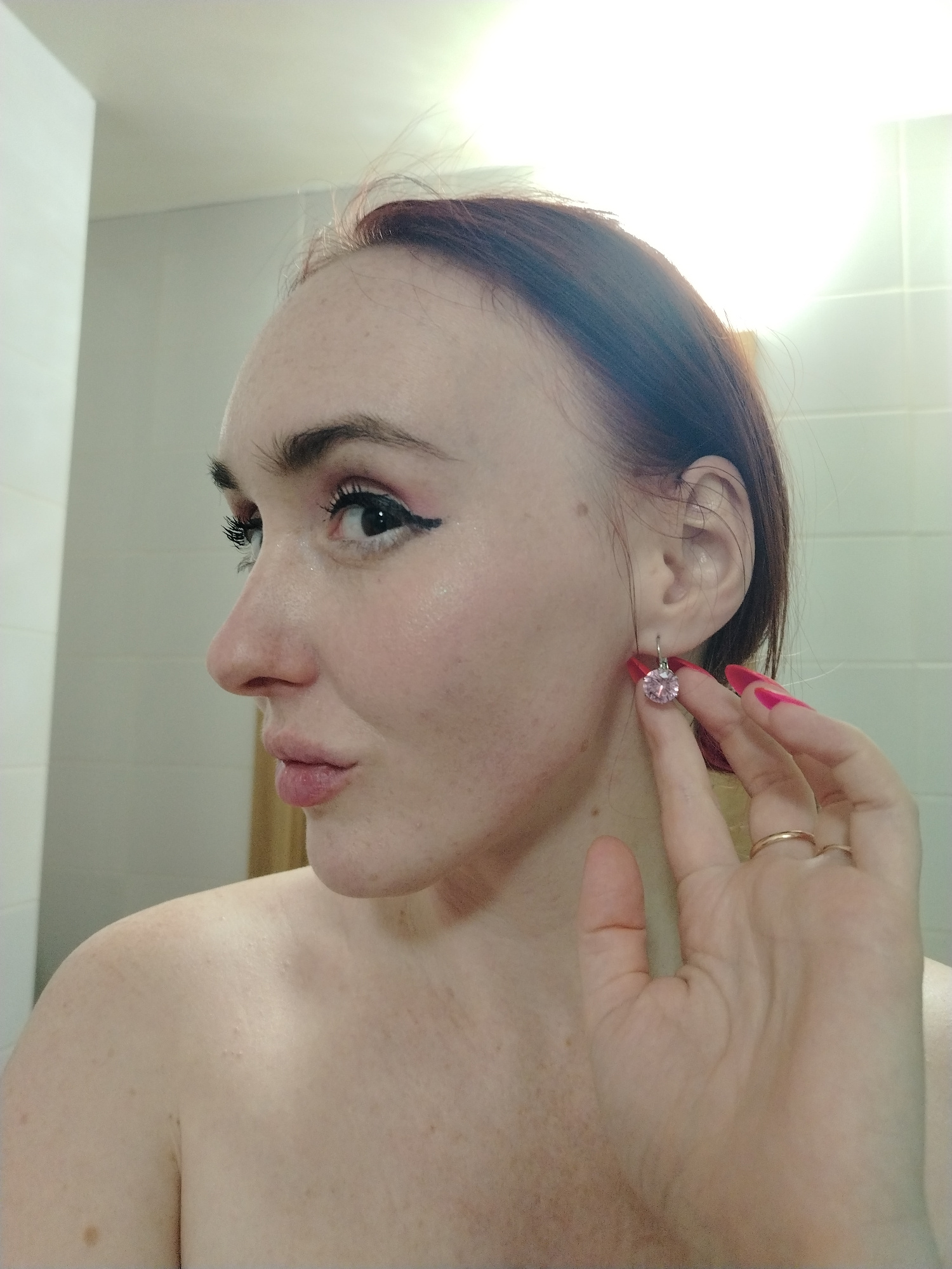 A fair-skinned woman with auburn hair is posing in a bathroom with white tile walls, likely in front of a mirror. She is seen from the shoulders up, facing left in profile with her head turned towardsβ¦read more