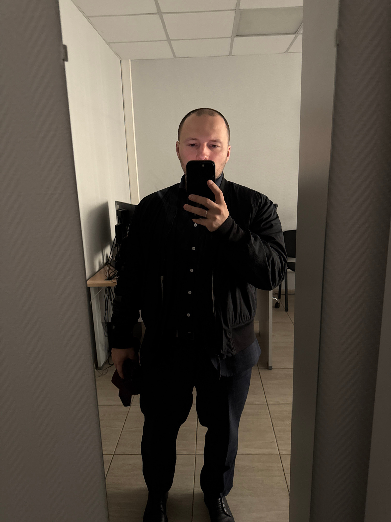 A man is taking a selfie in a mirror. He is wearing a black jacket and pants, and black shoes. He is holding a black smartphone. The background is a tiled wall and floor. There is a desk with cables a…read more