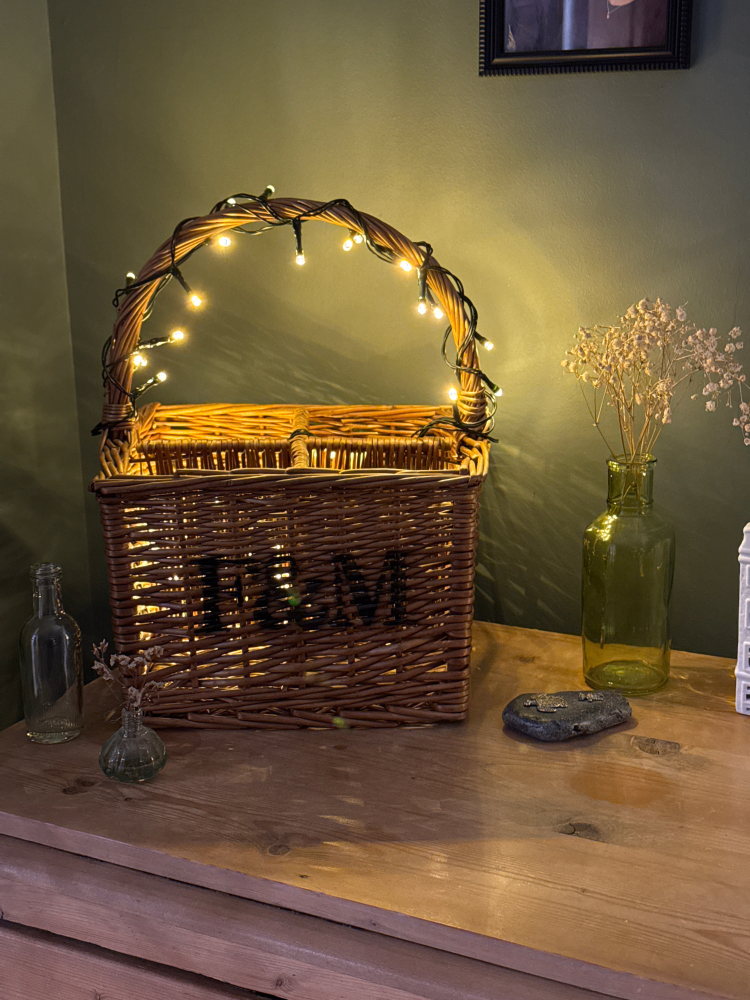 A still-life composition features a wicker basket, partially illuminated by fairy lights, on a wooden surface. The basket's handle arches upwards and is wrapped with the lights. Behind the basket, a g…read more