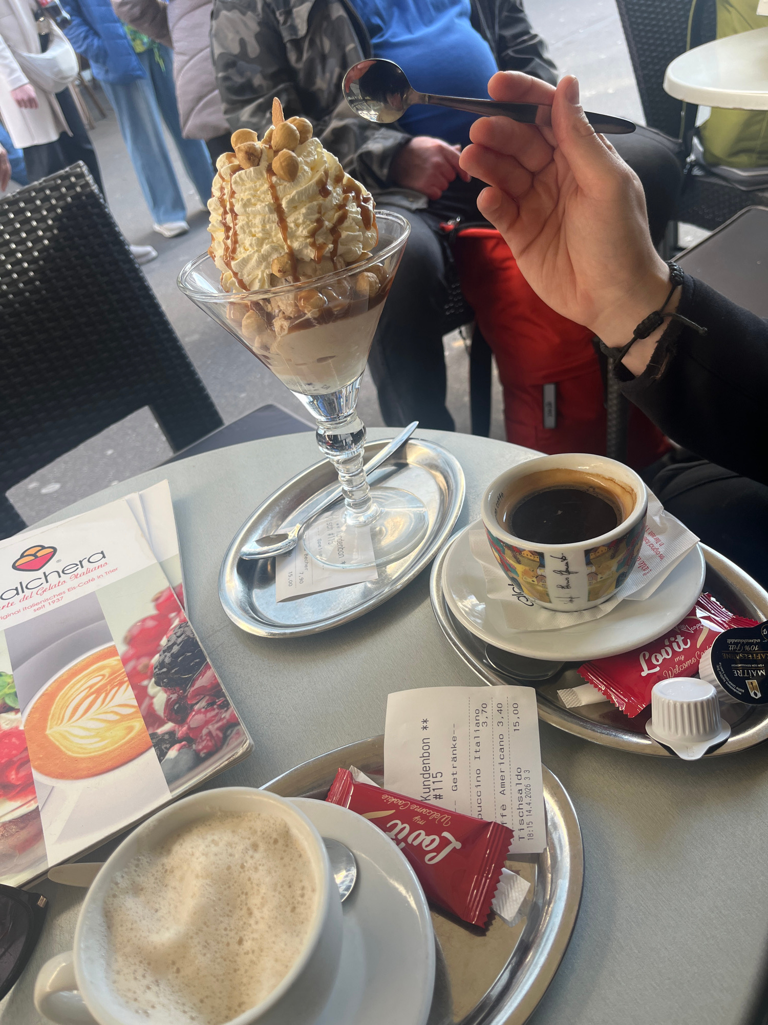 Here is a detailed description of the image: **General Description:** The image is a top-down view of a table at a café. The scene includes food, drinks, a receipt, promotional materials, and a perso…read more