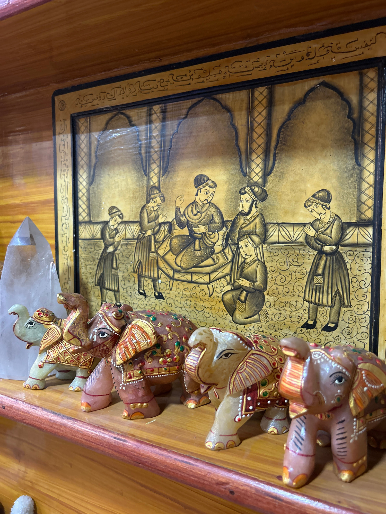 The image captures a detailed scene on a wooden surface, possibly a shelf or tabletop. A framed artwork with a golden-yellow backdrop is a central element. The artwork depicts a series of figures rend…read more
