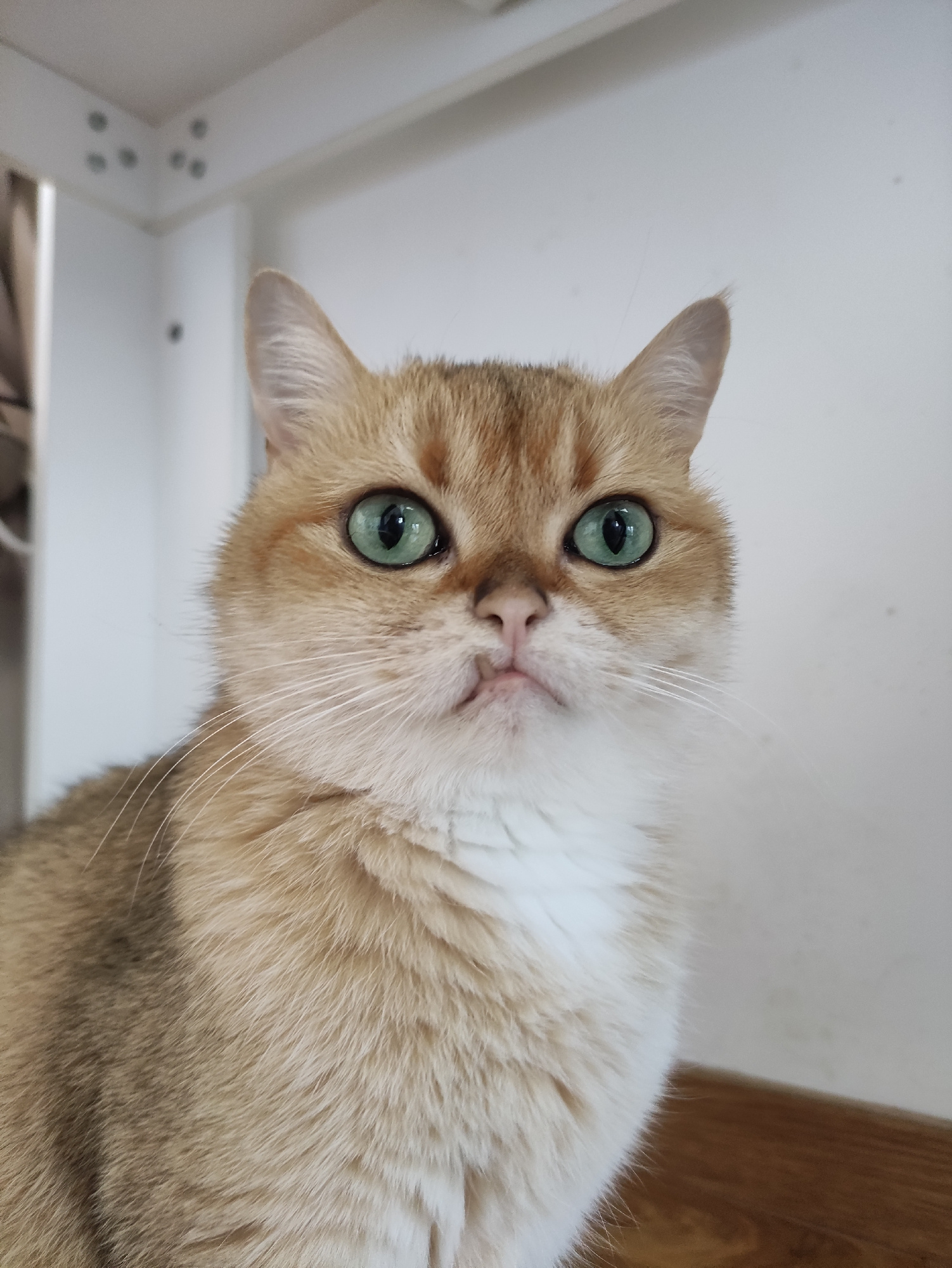 A close-up, high-angle shot features a cat with golden fur and striking green eyes. The cat's head is tilted slightly, looking upward toward the camera. Parts of white and wood-grain surfaces appear b…read more