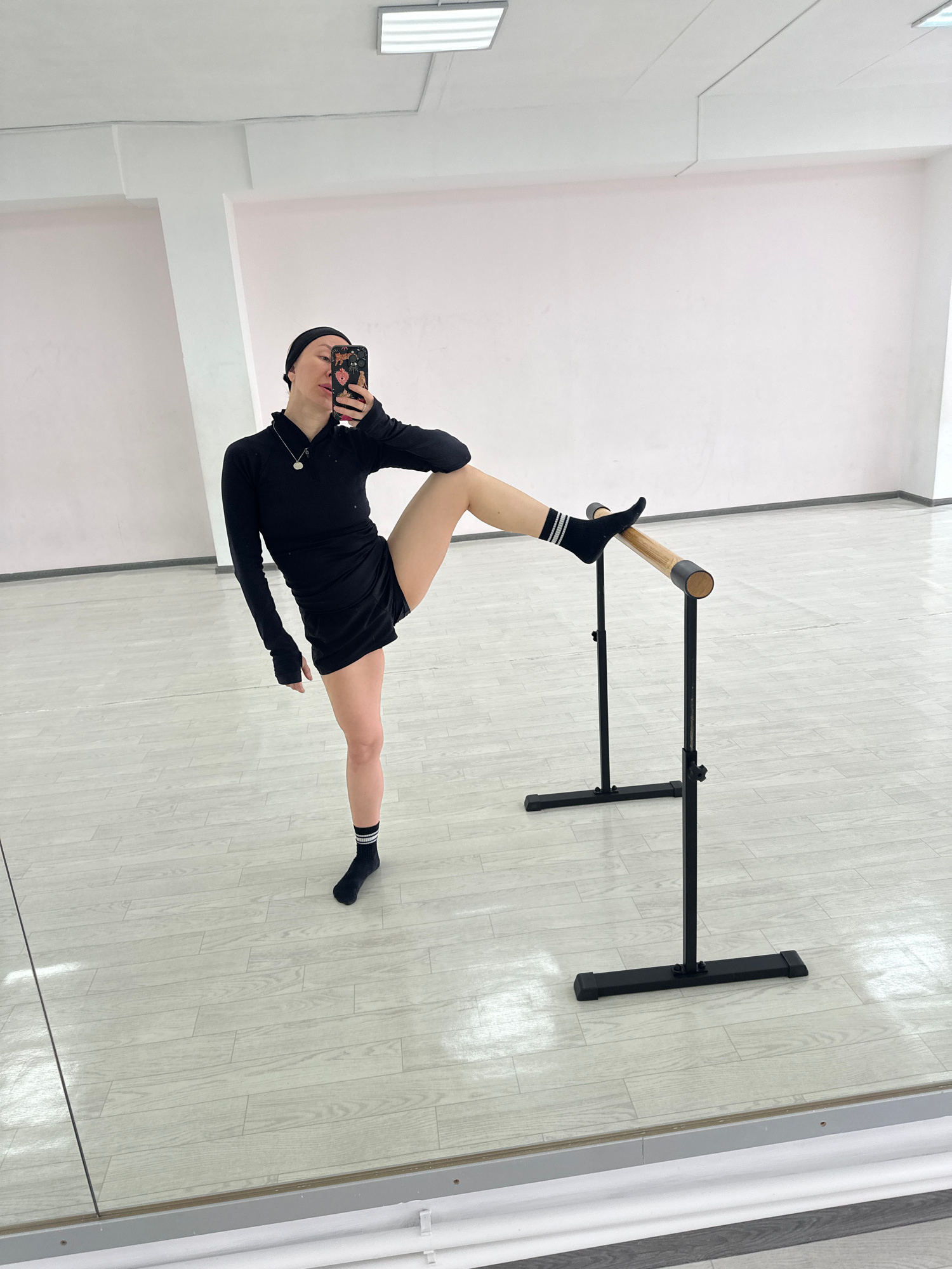 The image shows a person in a dance studio. The person is wearing a black long-sleeved shirt, black shorts, and black socks with white stripes, and appears to be a ballerina doing a ballet pose with o…read more