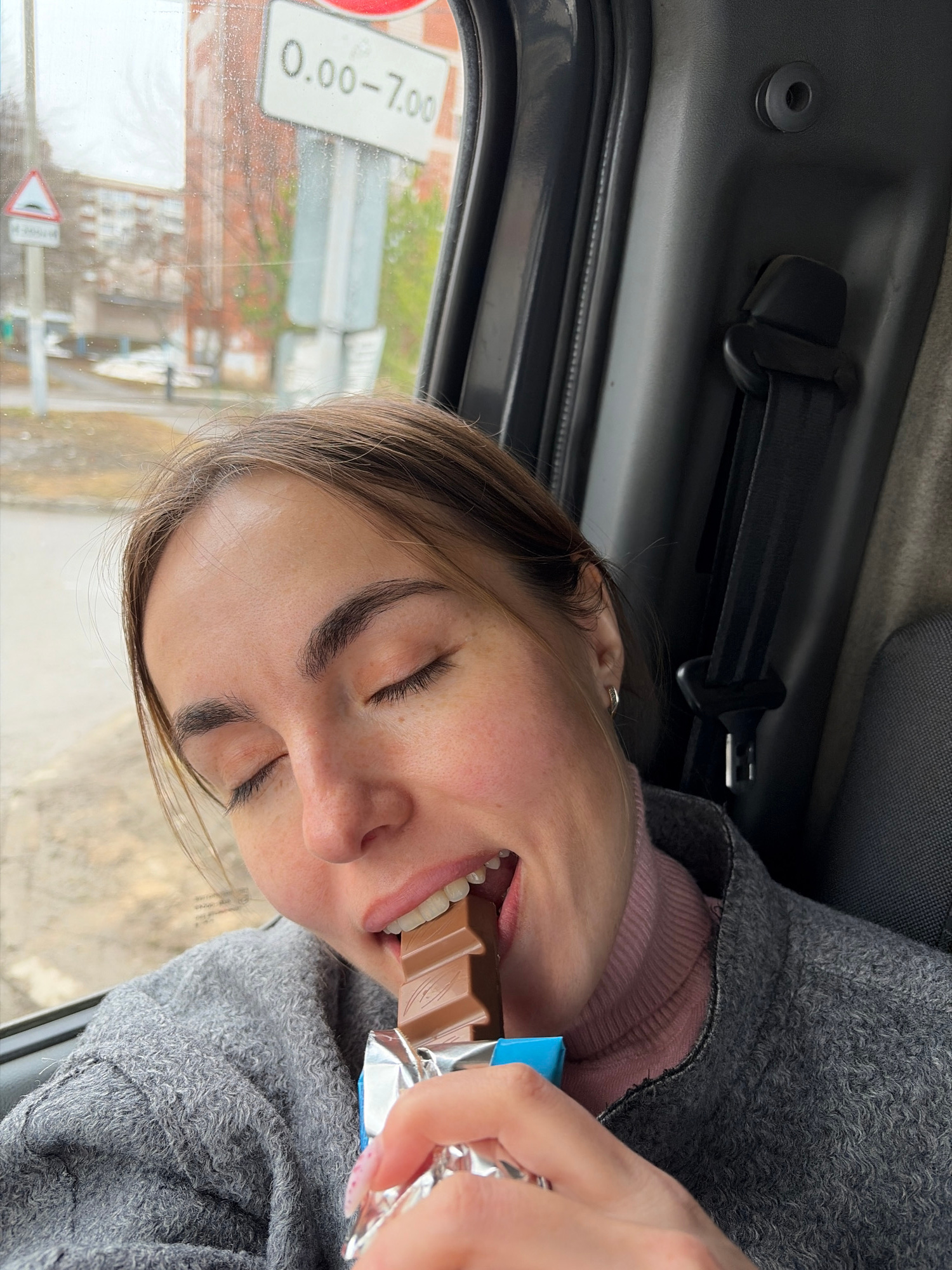 A woman is inside a vehicle, presumably a car, and is eating a bar of chocolate. She is wearing a gray, hooded jacket over a pink turtleneck sweater. The car's interior is dark gray. Outside the car w…read more