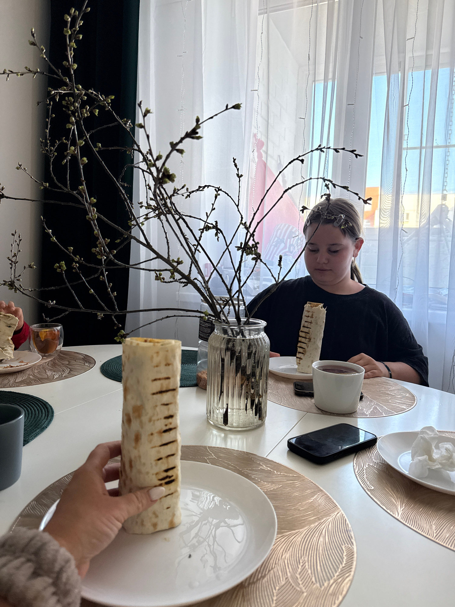 The image shows a domestic scene, possibly in a home or apartment. The primary subjects are two people seated at a white table. One individual, a young female, is wearing a dark shirt and has her hair…read more