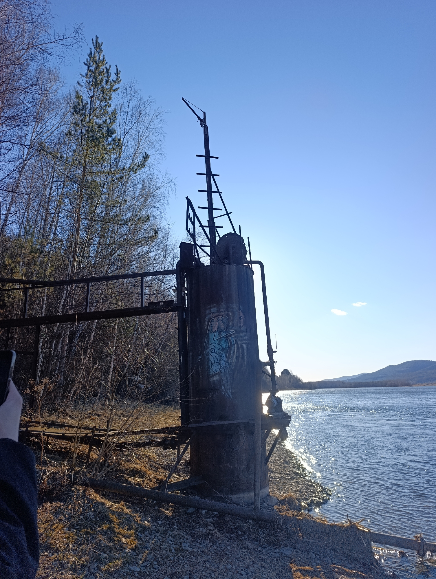 A rusted, cylindrical metal structure with attached pipes and a skeletal metal framework stands on a pebble-strewn shore next to a body of water, likely the Yenisey River. Graffiti marks the side of t…read more