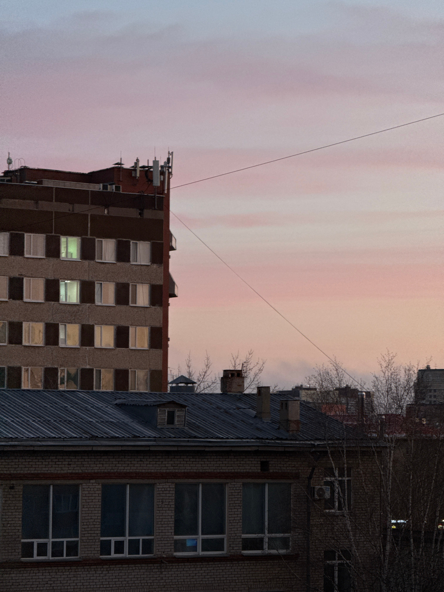 The image shows a vertical cityscape in Perm, Russia, taken during either dusk or dawn, judging by the pinkish-grey sky. Two buildings dominate the view. The first is a taller building with numerous w…read more