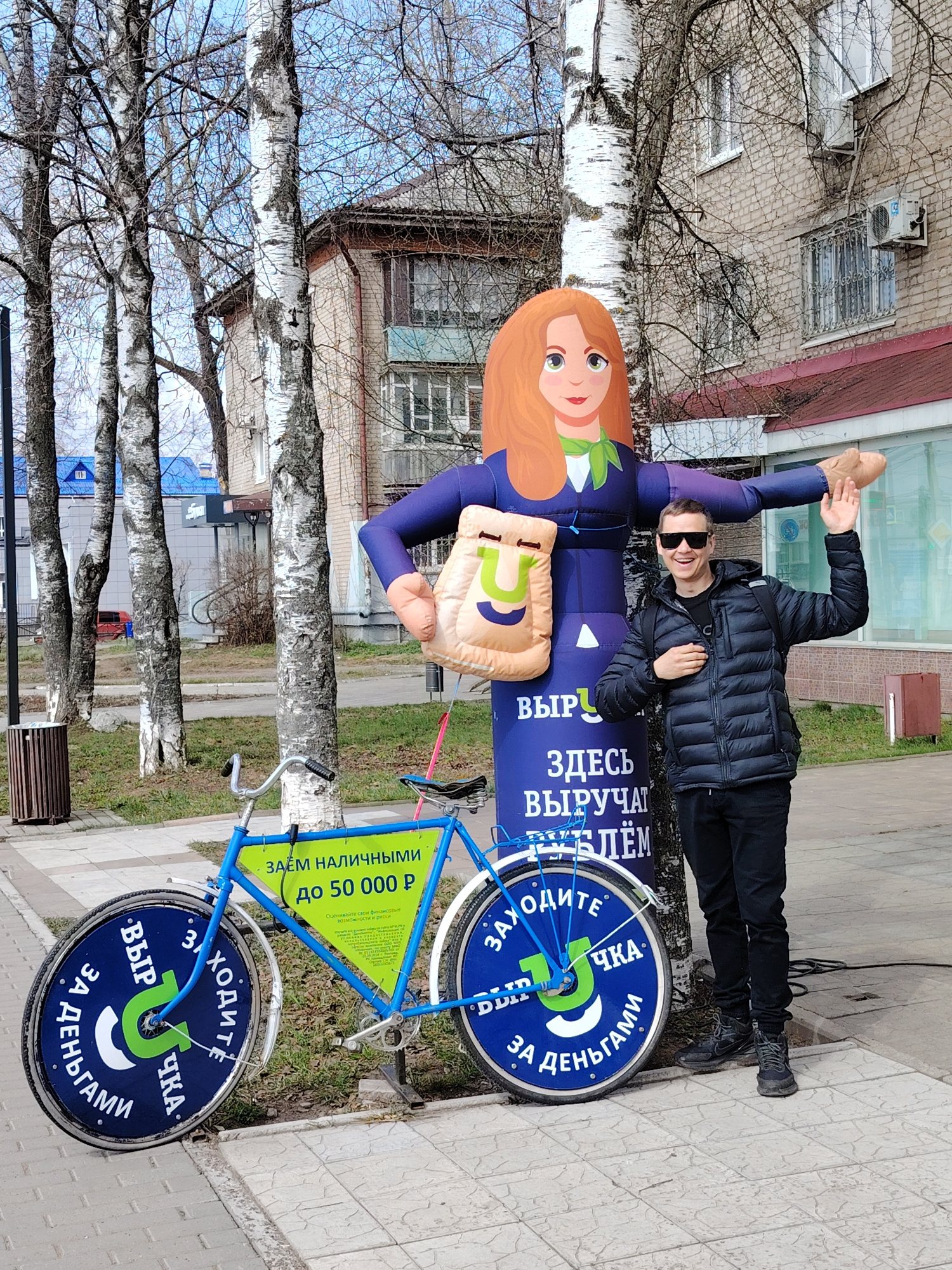 The image captures a bright, daytime street scene in Chaikovsky, Russia, likely in early spring given the bare branches of the trees. A smiling man, wearing a black puffer jacket, sunglasses, and a ba…read more