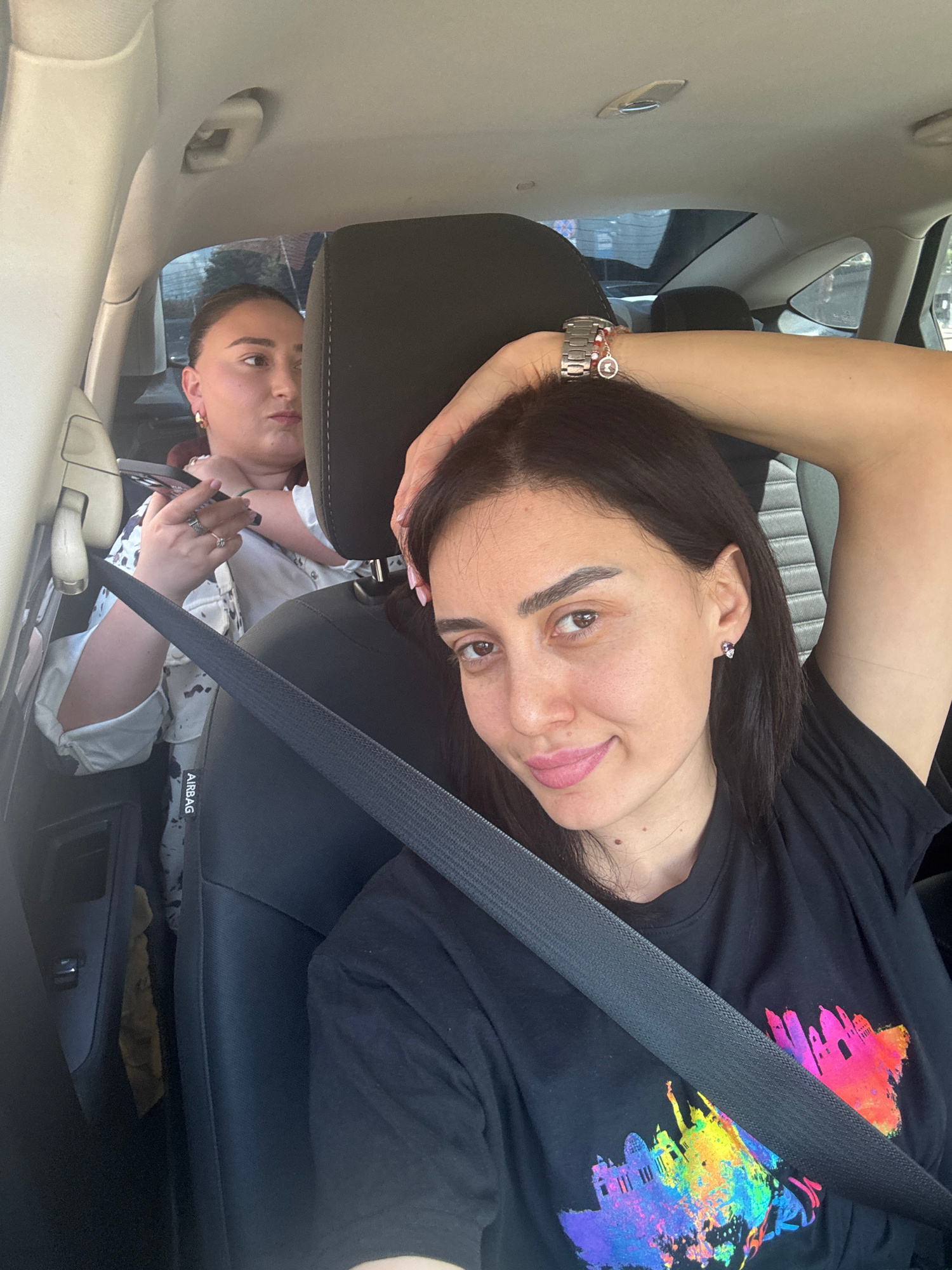 A woman with long, dark hair is sitting in the driver's seat of a car, wearing a black T-shirt with a colorful cityscape design and a seatbelt. She is leaning her head on the headrest and looking towa…read more