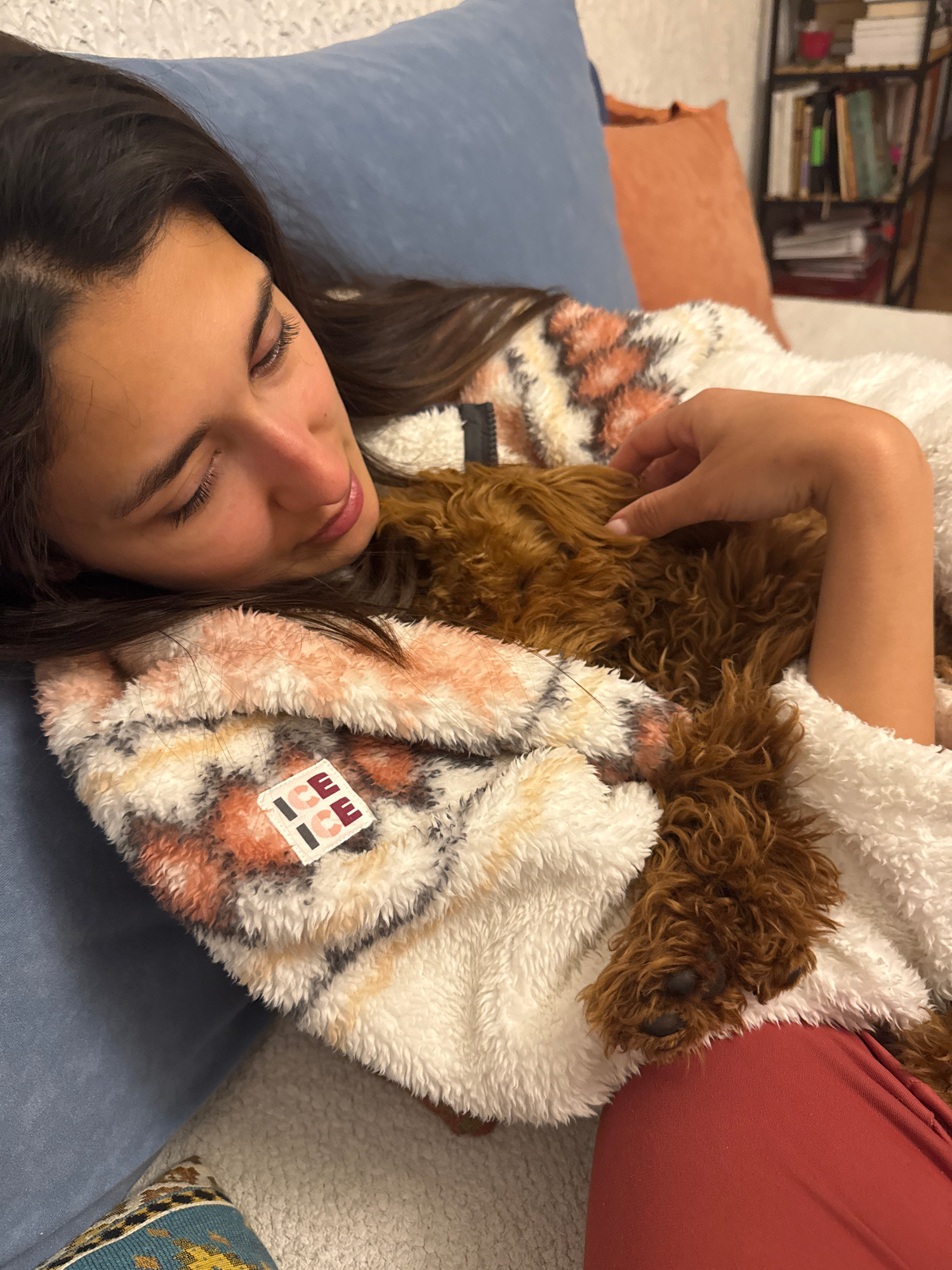 A young woman lies on a blue cushion or pillow, cradling a brown-haired dog. She is wearing red pants and a patterned white and orange fleece jacket. A throw pillow rests on a sofa behind the blue pil…read more