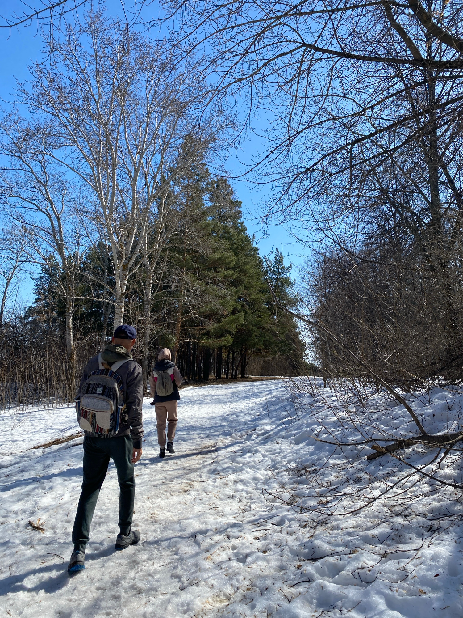 Two individuals are walking along a snowy path in a wooded area in Ulyanovsk, Russia. The path is covered in snow, and there are trees on either side. The sky is blue and clear. The first individual i…read more