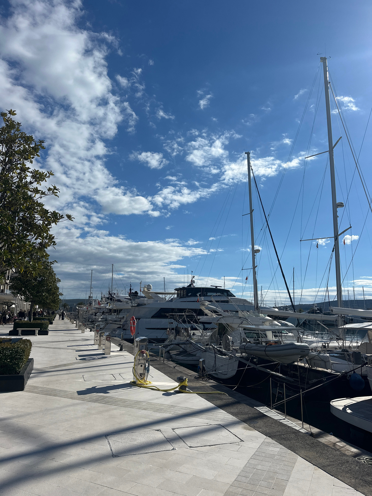 The image captures a bright day at Porto Montenegro in Tivat, Montenegro. Several yachts are docked along a modern, grey-tiled quay. The masts of the yachts reach high into a blue sky dotted with whit…read more