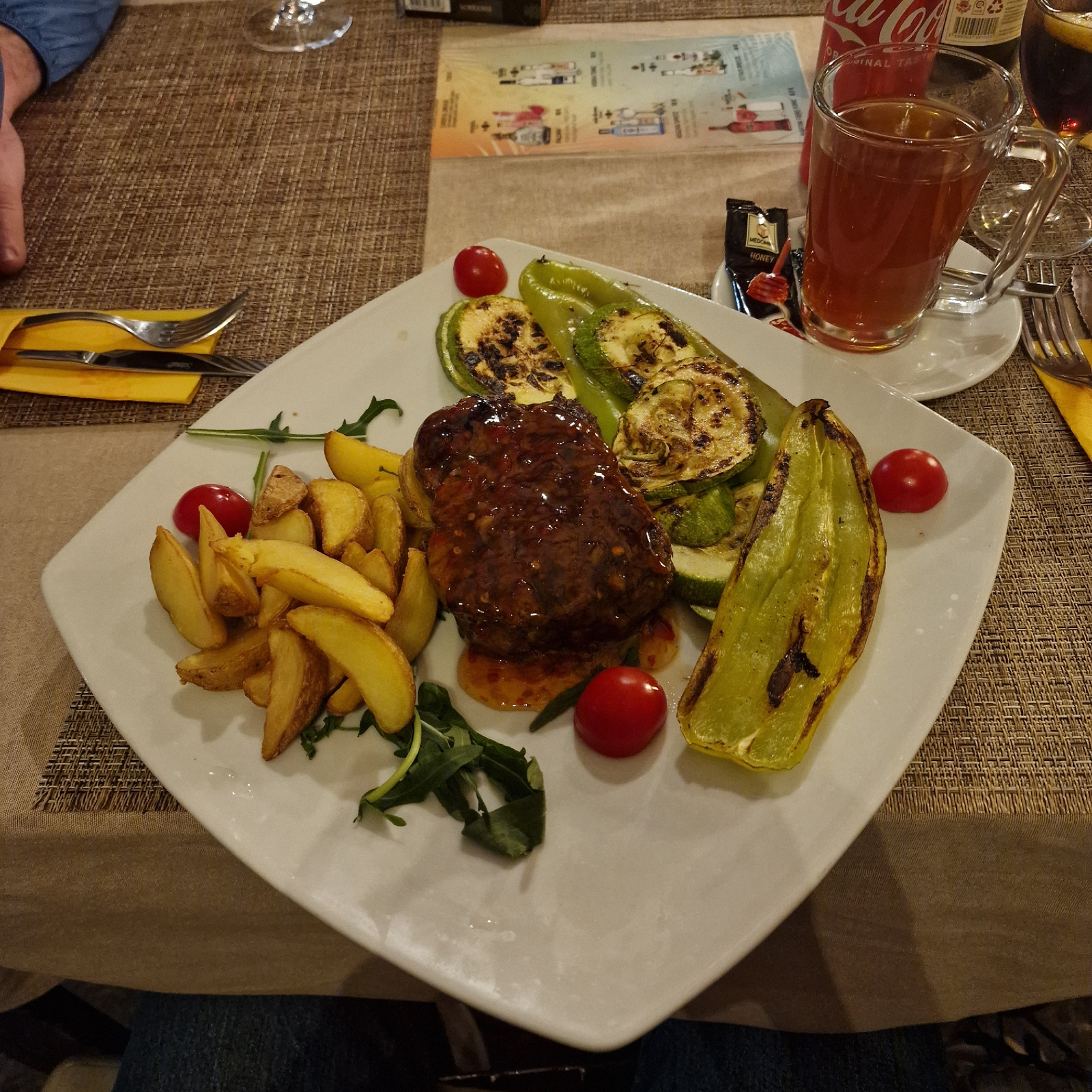 The image shows a meal served on a white, angular plate. The meal consists of a piece of meat covered in a dark sauce, grilled vegetables including zucchini and a lighter green squash, fried potato we…read more
