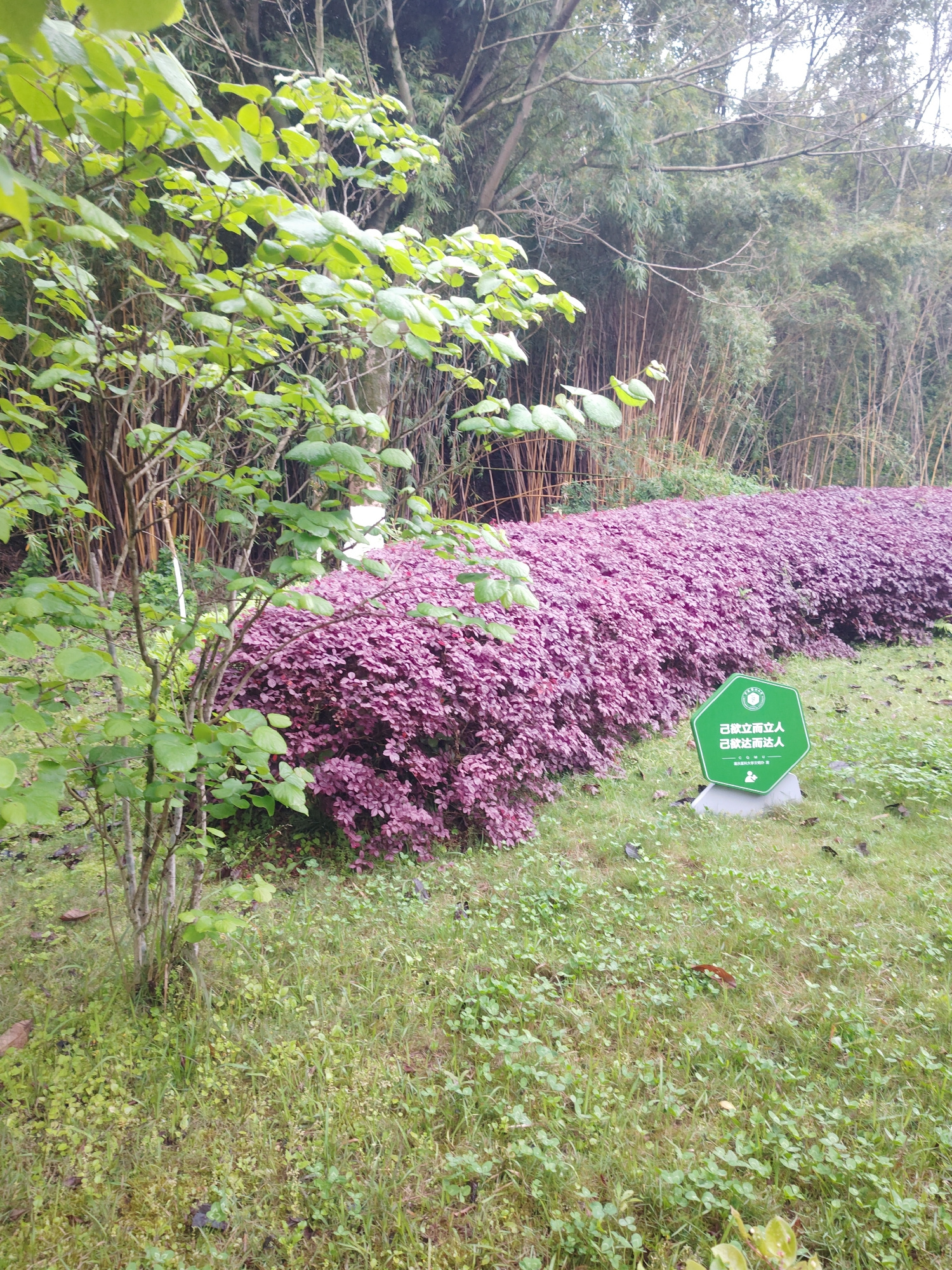 The image depicts a garden scene in what is likely Chongqing High-tech Zone, China, judging by the text on a green sign. The dominant feature is a dense hedge of purple plants. To the left of the hedgβ¦read more